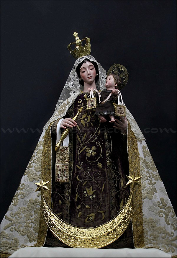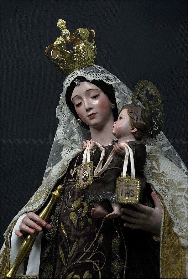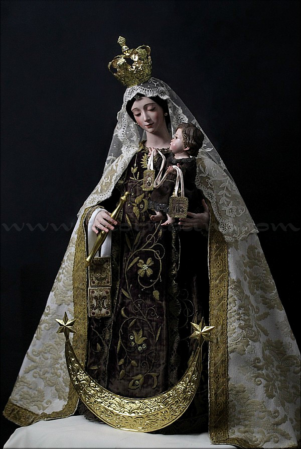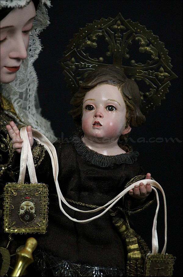 Nuestra Señora del Carmen Esta imagen ha sido realizada para una colección particular de Sevilla. Es obra de vestir, heredera de los grandes simulacros marianos de los siglos XVIII y XIX realizados por artistas como Salvador Carmona o Duque Cornejo, con estructura de candelero y solo completamente modeladas la cabeza y las manos de la Virgen y la figura del Niño. Está realizada en terracota policromada al óleo, con ojos de cristal artesanales y postizos de pelo natural en ambas imágenes. La Virgen, que porta el cetro en su mano derecha y sostiene al Niño con la izquierda, tiene una altura de 60 cm. Entre Madre e Hijo el autor ha querido reflejar ternura y complicidad. Frente a la solemnidad de María, representada como una doncella hermosa y noble, nos encontramos con la infantil espontaneidad de Jesús, que bendice a las ánimas al tiempo que les ofrece el escapulario con ambas manos. Su rostro refleja la delicadeza pueril y su cuerpo, como indicamos, es de talla completa y se ofrece desnudo bajo el hábito. |