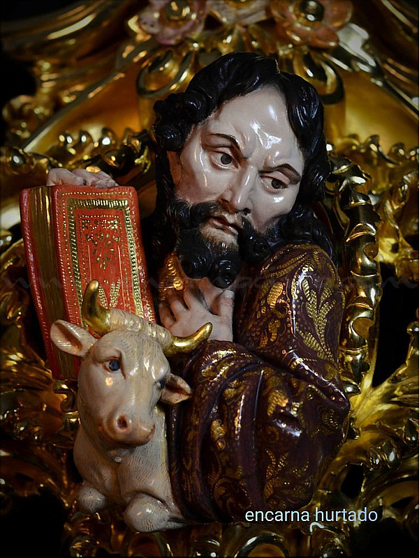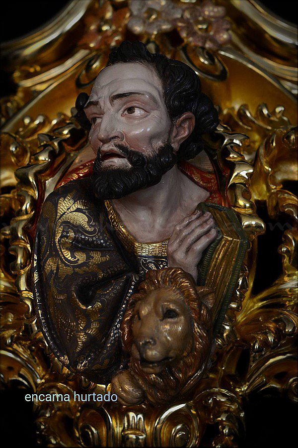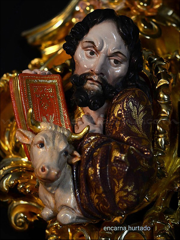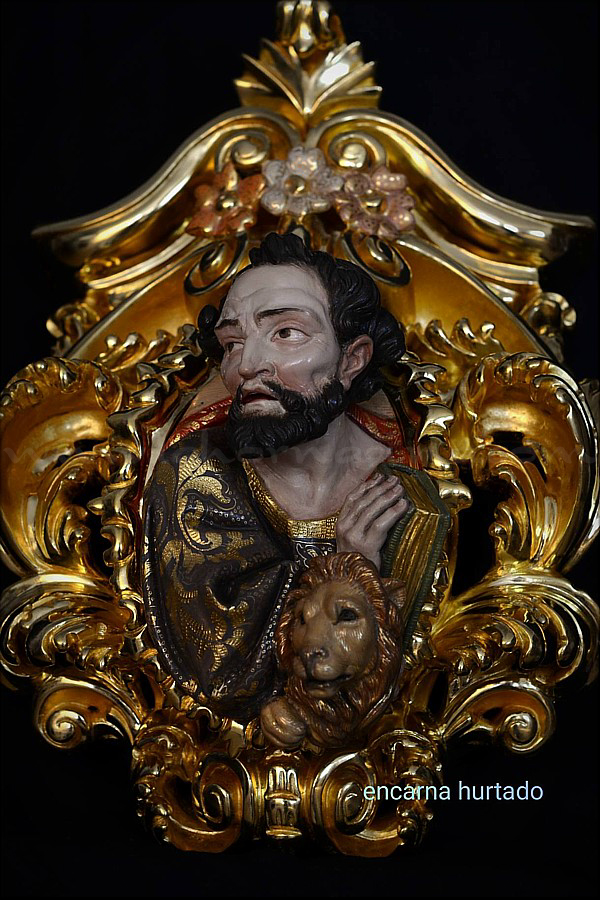 Nuevos relieves tallados para el paso procesional de Nuestro Padre Jesús Nazareno (Antonio Illanes, 1938), titular de la hermandad homónima del municipio sevillano de Alcalá de Guadaíra. Vienen a sumarse a los publicados en La Hornacina hace dos años, que representan a San Pedro y San Juan Evangelista. Se trata de dos bustos de los apóstoles San Lucas y San Marcos, realizados en madera de cedro tallada, policromada al óleo, dorada y con estofados al temple de huevo. Ambos se acompañan de sus evangelios y de sus atributos zoomorfos habituales: Lucas el toro y Marcos el león, símbolos de sacrificio y valentía, respectivamente. |