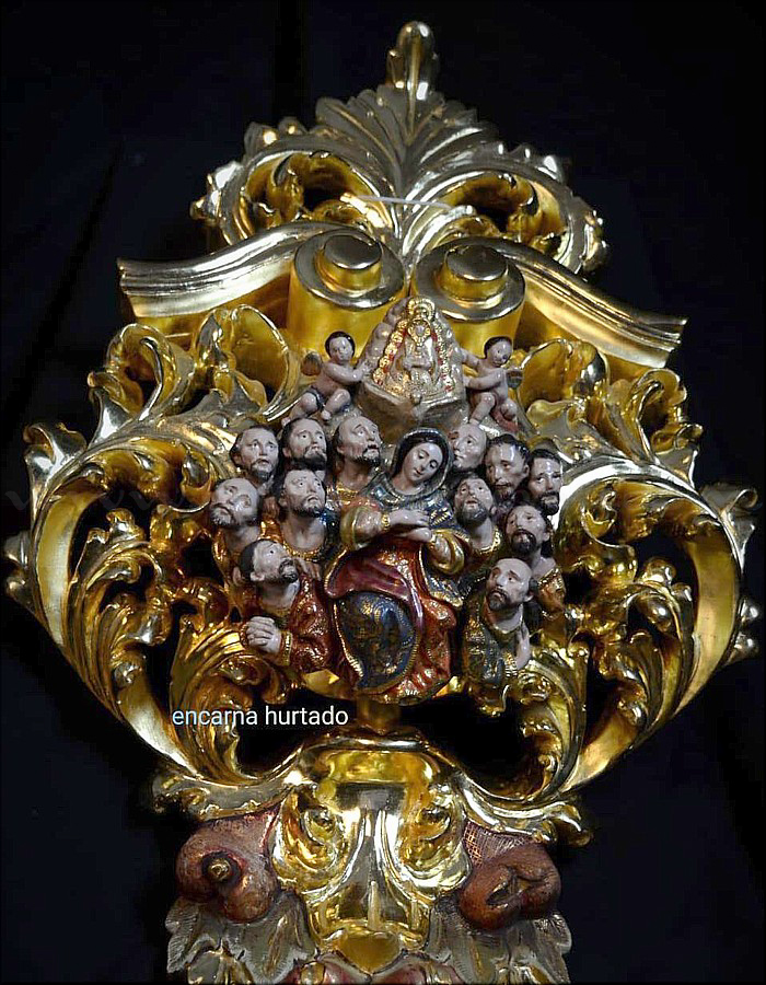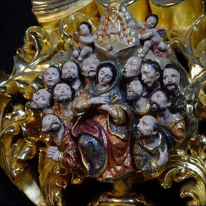 Nuevo relieve para el paso procesional de Nuestro Señor Jesucristo Resucitado (Jaime Babío, 1996-1998), titular de la cofradía homónima de El Puerto de Santa María (Cádiz). La pieza, de pequeño formato, se sitúa en el lateral izquierdo del canasto y representa la escena de la Venida del Espíritu Santo o Pentecostés. En su parte superior el relieve lleva una reproducción de la Virgen del Rocío, patrona de Almonte (Huelva), que figura portada por dos querubines. Según la cofradía, con este curioso detalle se incorpora a la escena el popular icono mariano relacionado con el Pentecostés, dotándola así de un profundo carácter devocional. Al igual que otras obras del mismo corte realizadas por la escultora e imaginera utrerana, tanto el limitado espacio al que debe ajustarse, como la abigarrada composición del pasaje, no son obstáculos para que cada figura sea tratada con esmero y de forma individualizada, lo que le otorga la calidad acostumbrada en su género. |