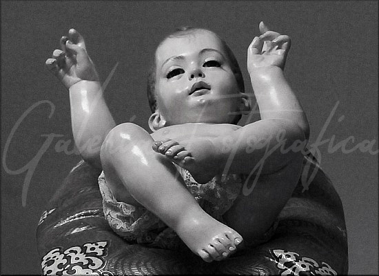 Niño Dios para una colección privada de Málaga. La escultura, totalmente anatomizada, ofrece un marcado naturalismo; más que la representación de un niño divinizado que bendice al espectador se diría que estamos ante la plasmación realista de una figura infantil en su lecho, pero sin perder su inspiración en la más pura esencia popular. El cojín de tonos rojizos sobre el que reposa muestra labores de dorado al agua y estofado al temple al huevo realizadas por Francisco José López Rondón, discípulo de Juan Bautista Jiménez, quien ha realizado una ornamentación barroca donde se repiten los motivos vegetales y cursivos, empleando varios tipos de grafismos de líneas, de los cuales llama totalmente la atención la imitación del muaré en el fondo rojo y, sobre todo, la caligrafía que aparece en el centro de la composición y que corresponde a la firma de dicho escultor. Pertenece al tipo de los llamados "niños de cuna" tan venerados en capillas privadas y conventuales, aunque también en los templos cuando se celebra la Misa del Gallo y otras ceremonias en las que los fieles acuden a besar el pie a Jesús con el fin de rememorar el momento en que, tras su nacimiento, el pueblo fue a postrarse ante el Santo Pesebre. |