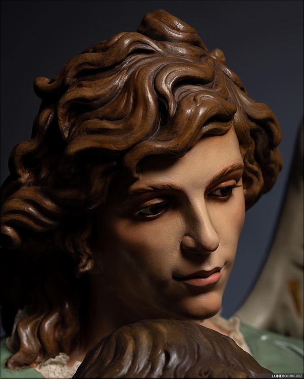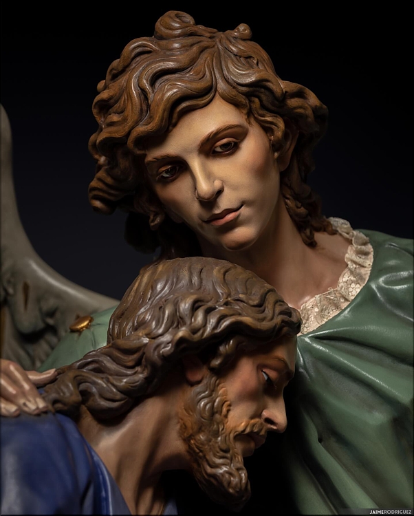 Santísimo Cristo del Consuelo (Jesús Consolado) Primer conjunto escultórico de talla completa del escultor e imaginero sevillano. Fue presentado ayer en el salón de actos del colegio alicantino Ángel de la Guardia, siendo fruto de la iniciativa conjunta de dicha institución educativa y de la Cofradía Sacramental del Divino Amor y Nuestra Señora de la Soledad (La Marinera), de cuyas procesiones formará parte a partir de la próxima Semana Santa. José María Leal ha sido encargado también del diseño de este nuevo grupo, que destaca por su imponente composición y por la cuidada simbología que encierra cada uno de los elementos que lo componen. Fue durante la presentación del boceto en barro, el 4 de octubre del año 2024, cuando el artista explicó que se ha inspirado en la tradición procesional de la Semana Santa alicantina, pero con elementos innovadores que aportan un aire fresco a esta manifestación cultural. La obra representa el pasaje de la Oración en el Huerto según el evangelio del apóstol Lucas, concentrando toda la acción en los dos personajes fundamentales, que son Jesús y el ángel confortador, tradicionalmente llamado Egudiel. No aparecen los apóstoles ni los soldados, aumentando así el dramatismo de la escena. Leal destaca igualmente el minucioso trabajo de talla y el uso en su integridad de materiales nobles: madera de cedro y policromía al óleo, esta última de colores lisos y tonalidades suaves, lo que ayuda a crear una atmósfera de dulzura y delicadeza entre los personajes. Se utilizan también ojos de cristal, pestañas de pelo natural y encaje en el cuello y los puños del ángel, si bien se prescinde de nimbo y cualquier otra presea. El autor incide en la sensibilidad y la ternura del momento como respuesta al consuelo que Jesús recibe del ángel, de ahí que lo muestre arrodillado, con los brazos orantes sobre la rodilla de Egudiel y la cabeza apoyada en su pecho. Por el sosiego que adopta la expresión de Cristo podemos afirmar que se plasman los instantes posteriores a su agonía, en los que, aunque todavía se muestra abatido, la desazón ya se ha convertido en aceptación de los designios divinos. |