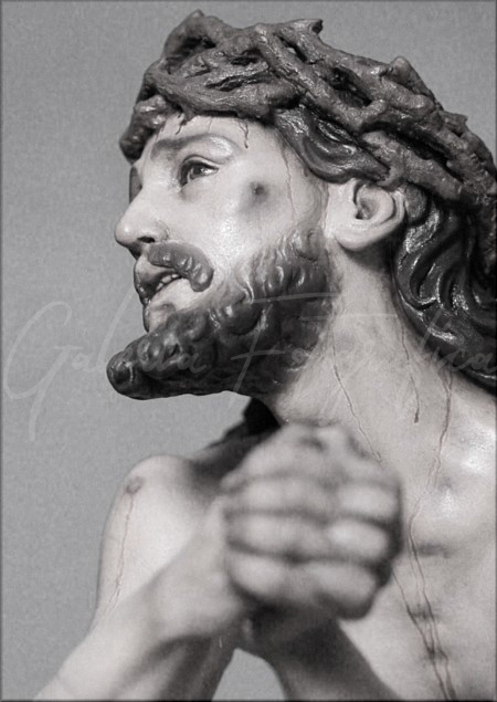 Cristo de las Penas Esta imagen de tamaño inferior del natural (50 cm), realizada sin encargo previo en terracota policromada al óleo, representa a Jesús sedente y coronado de espinas en el monte Calvario, durante los momentos previos a su crucifixión, mostrando una actitud implorante y en oración con el Padre. Cristo se dispone con el tronco ligeramente inclinado hacia delante, las manos entrelazadas y las piernas cruzadas, configurando una postura introspectiva y cargada de tensión emocional. Toda la composición se establece sobre una base rocosa texturizada, concebida como soporte narrativo y estructural. La imagen presenta un estudio detallado de la martirizada anatomía y una policromía naturalista y rica en matices que aportan un gran verismo. Reposa sobre peana de madera de pino torneada, tallada por Javier González, y dorada al agua con oro de 23 ¾ kilates por el propio López Rondón. Se trata de una pieza sacra que busca transmitir al espectador un momento de soledad, entrega y reflexión interior. El joven autor ha tenido presente, de cara a su ejecución, la modélica obra pasionista del pintor y grabador Alberto Durero y el barroquismo del escultor flamenco José de Arce. |