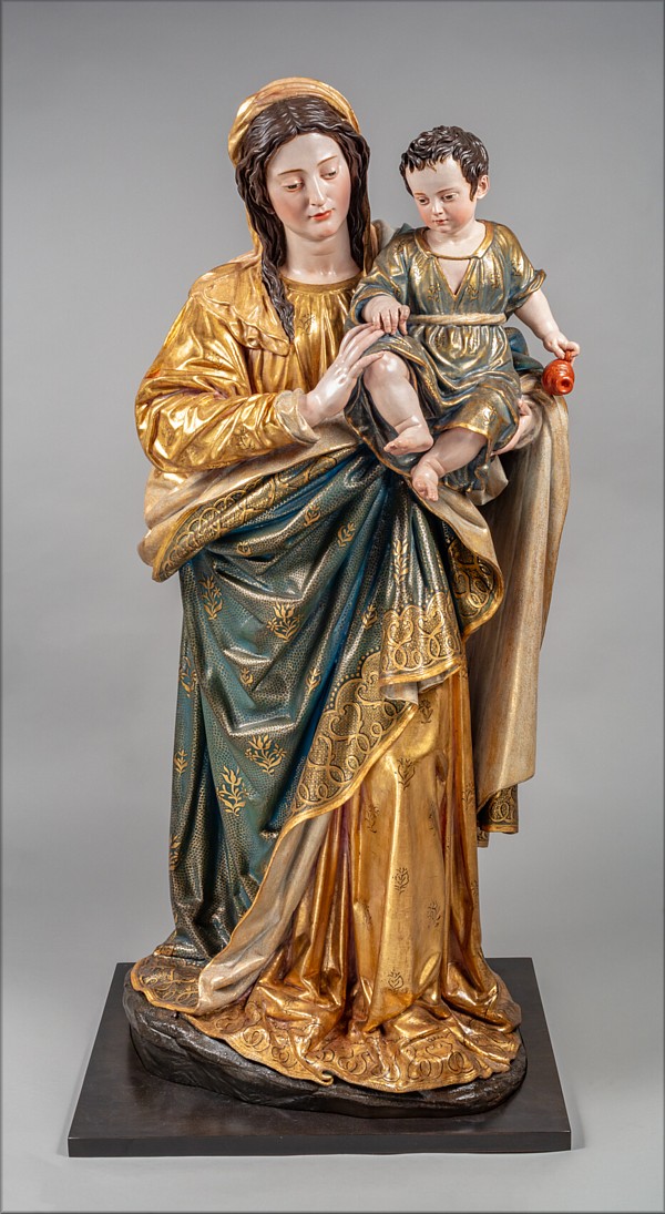 La pieza en cuestión es una representación de la Virgen con el Niño, popularmente conocida como Virgen de las Cuevas por haber sido realizada por el escultor e imaginero cordobés Juan de Mesa y Velasco, junto a la talla de San Juan Bautista, para recibir culto en los retablos colaterales del coro de legos de la cartuja sevillana de Santa María de las Cuevas. Tras la desamortización pasó al Museo de Bellas Artes de Sevilla (MBASE). Esta escultura fue durante mucho tiempo fue atribuida a Juan Martínez Montañés, a quien se le encargó en 1618 mediante contrato que quedó suspendido en 1621. Dos años más tarde fue otorgado a su discípulo Juan de Mesa, quien se hizo cargo de las tallas por el mismo dinero y en las mismas condiciones que su maestro. la imagen de María se relaciona con la que hizo Montañés para la Capilla del Reservado de la Cartuja, mientras que el Niño evoca las representaciones infantiles del retablo jerónimo de San Isidoro del Campo. La obra de Mesa inspirará otras análogas como la Vigen de la Oliva que Alonso Cano legó a la parroquial lebrijana. La imagen, de tamaño inferior del natural (137 x 66 x 47 cm) está tallada en madera de cedro, ahuecada en el núcleo central y compuesta por tres grandes bloques unidos a unión viva y reforzadas con clavos de forja. Como muestra el estudio radiográfico, son especialmente significativos, por su tamaño, los que sujetan la obra por su base. La obra está policromada: las carnaciones al óleo y los ropajes con la técnica del estofado sobredorado al agua con pan de oro. |