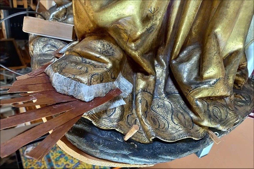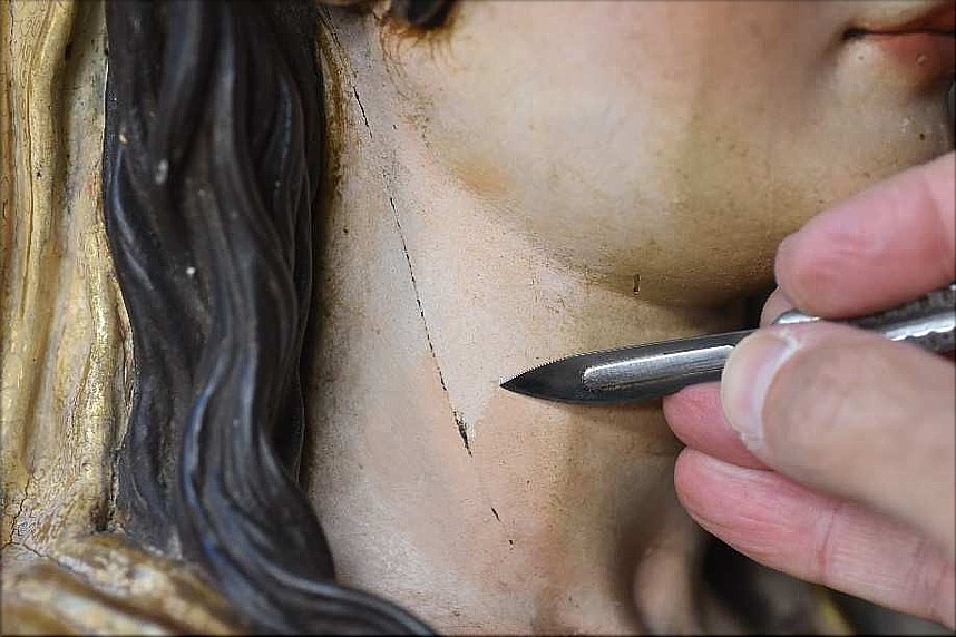 El estado de conservación era deficiente: en el soporte había uniones marcadas, apertura de ensambles, grietas, roturas y orificios; en los estratos polícromos, cuarteado con peligro de desprendimiento en algunas zonas. También existían lagunas con pérdidas de preparación, color y dorado por desprendimientos, así como zonas muy desgastadas, sobre todo en los ropajes. Asimismo, la policromía presentaba gran cantidad de suciedad acumulada, restos de barnices oxidados y repintes muy abundantes en las carnaciones. La intervención llevada a cabo por el conservador-restaurador Ignacio Bolaños ha consistido, por un lado, en la fijación de los estratos polícromos, proceso de limpieza de estratos superficiales y eliminación de la suciedad, barnices envejecidos y repintes. Por otro lado, se han consolidado grietas y fisuras con la colocación de chirlatas de madera en las aberturas de los ensambles, inserción de espigas en orificios y sustitución de tornillos industriales por espigas de madera. Toda la madera utilizada ha sido de cedro. Posteriormente, se han estucado todas las faltas de policromía, así como las grietas, fisuras y zonas espigadas en la fase anterior, tras lo cual se ha procedido a la reintegración cromática con técnica acuosa y se ha finalizado la intervención con la primera aplicación de barniz, el ajuste de color con pigmentos al barniz y una capa de protección final. |