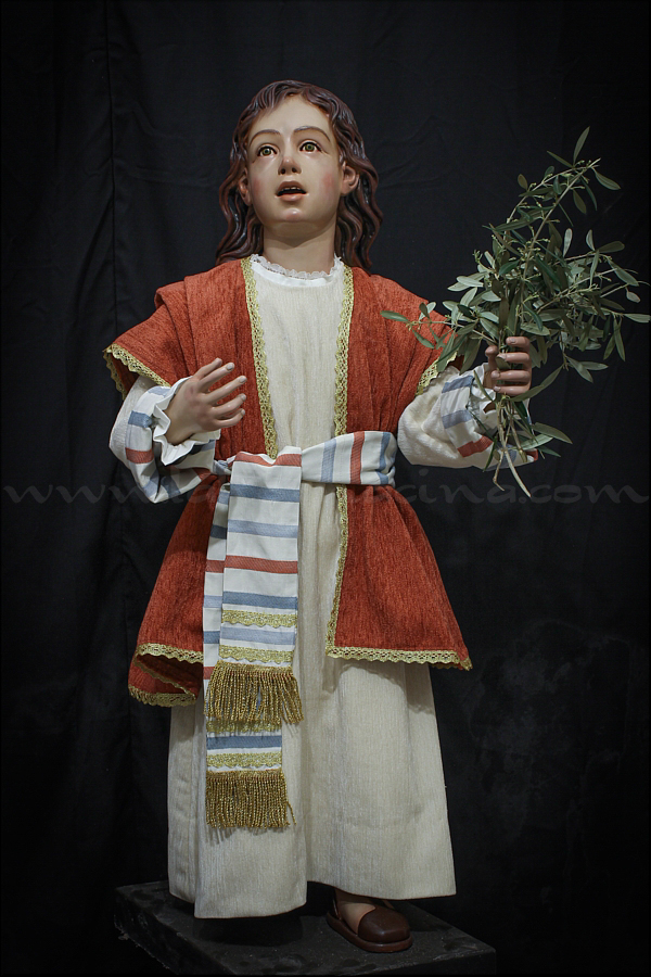 Ramón Martín Pareja de niños hebreos para el misterio procesional de la Cofradía de la Entrada Triunfal de Jesús en Jerusalén (La Borriquita), de Baena (Córdoba). Fueron presentados el pasado 9 de marzo en la Iglesia de Santa María la Mayor de la localidad, sede canónica de dicha corporación del Domingo de Ramos. Las imágenes representan a un niño de pie y a una niña arrodillada, y miden 120 cm y 100 cm de altura, respectivamente. Ambas han sido talladas en madera de cedro y policromadas al óleo con expresión de alborozo ante la venida del Mesías. Los ropajes han sido diseñados también por el escultor e imaginero de El Viso del Alcor (Sevilla). |