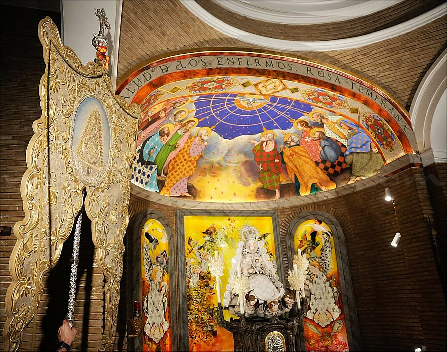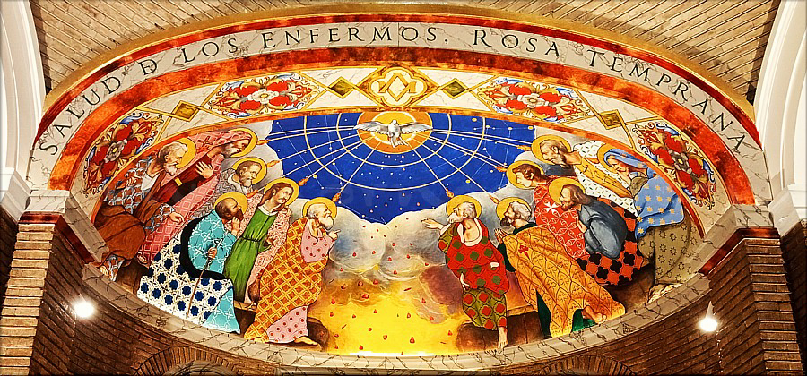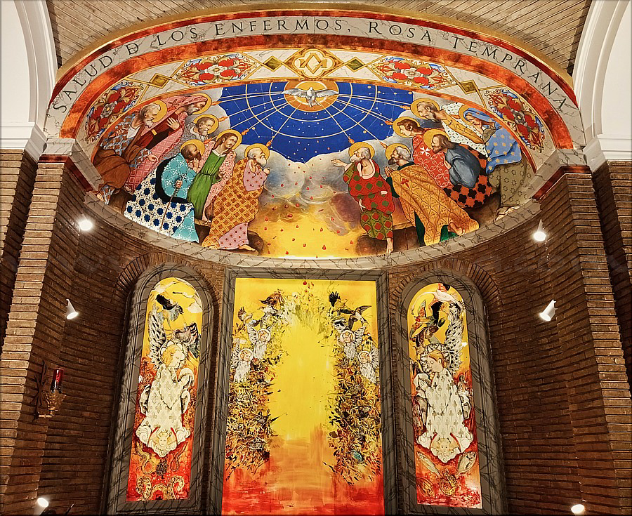 Antonio Díaz Arnido Pintura mural del Pentecostés para el proyecto Rocío, luz de vida del Hospital Universitario Virgen del Rocío (Sevilla), cuya labor escultórica ha corrido a cargo, como les informamos, de Manuel Caliani. La pintura de Arnido, realizada en técnica mixta, cuenta con unas dimensiones aproximadas de 20 metros cuadrados de superficie. Esta obra pictórica se construye en base a dos superficies murales claramente diferenciadas: la cúpula del ábside propiamente dicha -de las llamadas de cuarto de esfera- y su embocadura. En la cúpula vemos la Venida del Espíritu Santo en Pentecostés. En la clave aparece una paloma, símbolo del Espíritu Santo, del que brotan las lenguas de fuego que se posan sobre las cabezas de cada uno de los apóstoles. Estos están tratados con marcado carácter naturalista en sus retratos, representando las tres edades del ser humano. En la zona superior vemos un cielo plagado de estrellas, entre las que destacan las constelaciones de Tauro y Géminis, cuyos signos zodiacales enmarcan cronológicamente la fecha cambiante- desde el punto de vista astronómico- de la fiesta de Pentecostés. De la zona superior caen también pétalos de rosas rojas, en alusión a la celebración anual de Pentecostés en la Basílica de Santa María de los Mártires (antiguo Panteón de Agripa) de la ciudad de Roma, epicentro mundial de la Iglesia Católica. Respecto a la embocadura, se distinguen, a su vez, otras dos superficies pictóricas: el intradós, en el que aparece el anagrama de María rodeado de ornamentación vegetal, y el arco exterior, en el que sobre una decoración que imita texturas pétreas y marmóreas, leemos en letras verdes (color de la Hermandad Matriz del Rocío de Almonte) el lema SALUD DE LOS ENFERMOS, ROSA TEMPRANA, extraído de la popular sevillana "No es obra humana", inspirada en los versos del religioso y escritor Juan Francisco Muñoz y Pabón. |