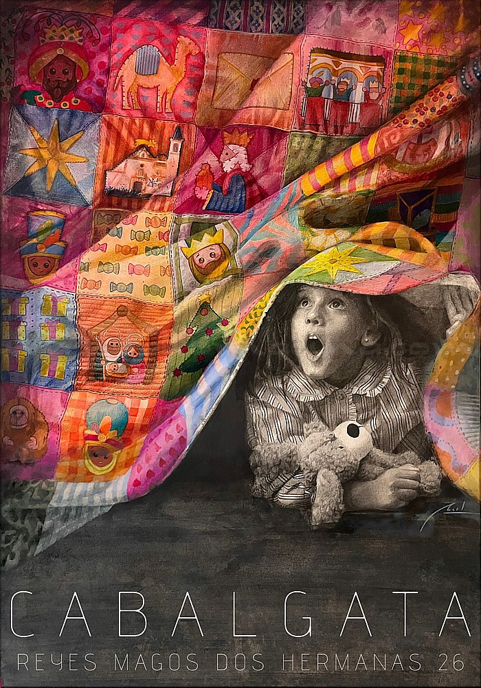 Juan Miguel Martín Mena El cartel de la Cabalgata de Reyes Magos de Dos Hermanas 2026 ha sido realizado por el artista local en técnica mixta sobre papel encolado a tabla (100 x 70 cm). Ofrece una imagen tierna y evocadora de la ilusión infantil ante el evento. La obra combina una figura infantil en blanco y negro -tratada con un grafismo delicado y atemporal- con una colcha llena de color, donde aparecen motivos alusivos a los Reyes Magos y a la magia de la noche del 5 de enero. Ese contraste entre la sobriedad de la niña y la explosión cromática de la colcha crea un lenguaje visual que sintetiza la esencia de la fiesta: la mezcla de sueño, tradición y fantasía que vive cada niño. La composición limpia y cercana de esta pintura de Juan Miguel Martín Mena convierte la figura pictórica del cartel anunciador en una imagen accesible, emotiva y plenamente identificable por el público, especialmente el infantil. |