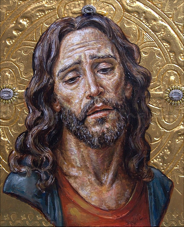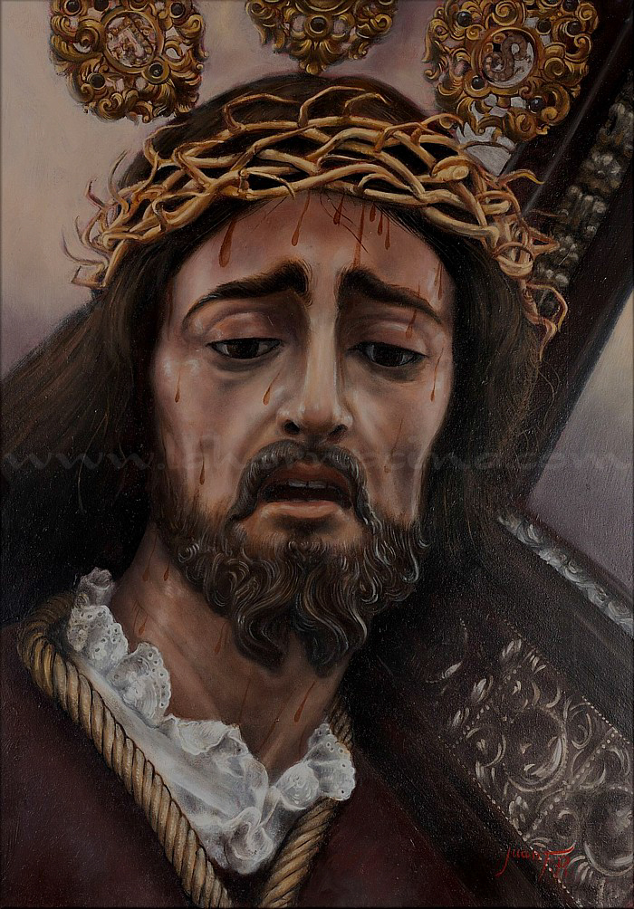 Juan Fernández Robles Pintura al óleo sobre tabla para una colección privada. El pintor de Estepa (Sevilla), licenciado en Bellas Artes y grado en Restauración y Conservación de Bienes Culturales, retrata una de las imágenes procesionales más populares de su localidad natal: Nuestro Padre Jesús Nazareno. El Nazareno estepeño es obra del célebre escultor e imaginero Luis Salvador Carmona (1708-1767), del que se conocen otras dos espléndidas creaciones sobre la iconografía de Cristo con la cruz a cuestas, estrechamente vinculadas todas ellas: el Nazareno de Mérida (Badajoz) y el de La Bañeza (León). |