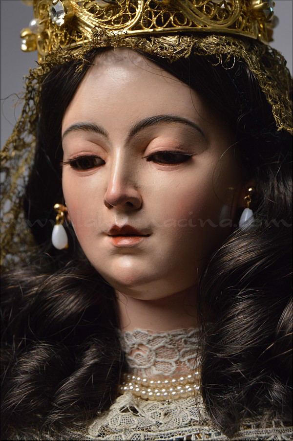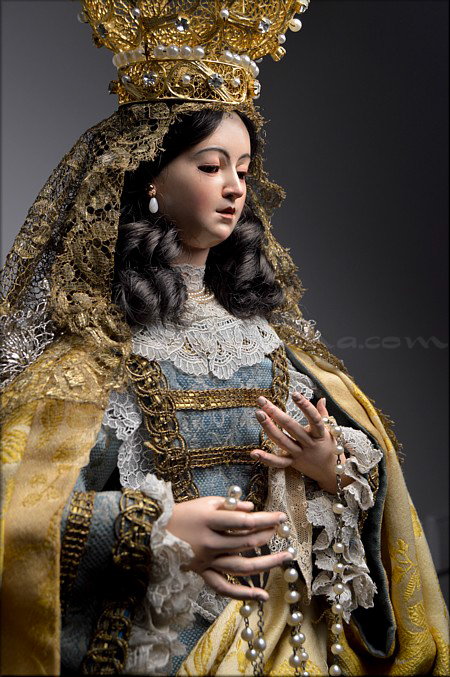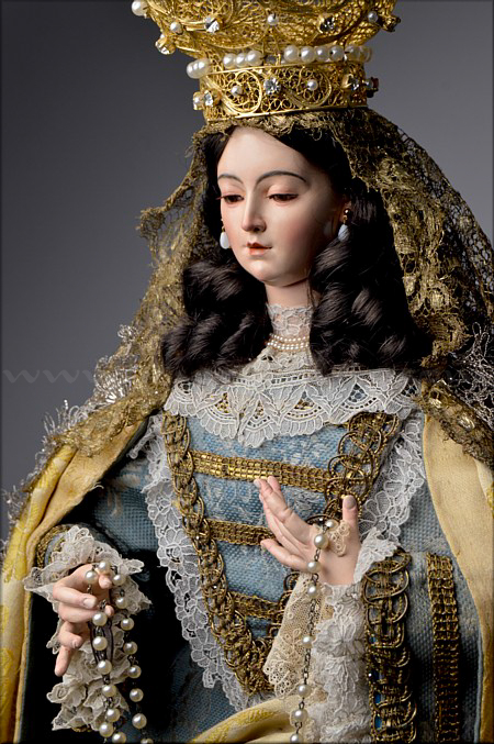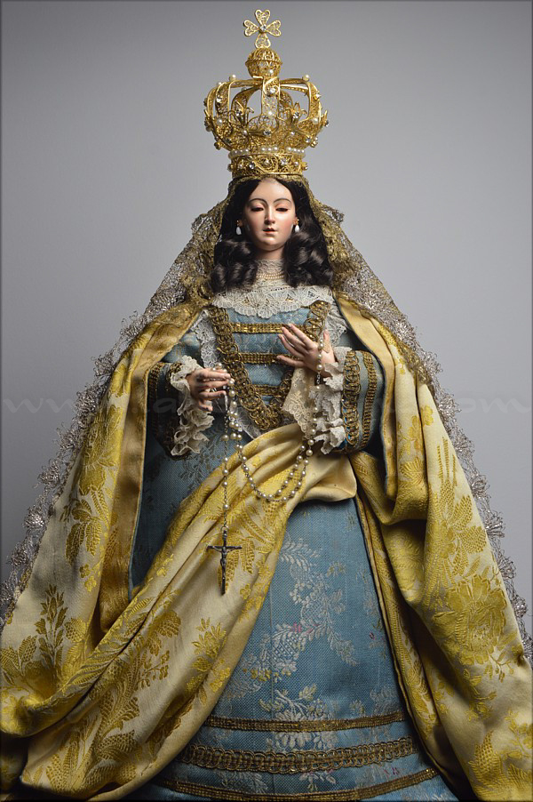Carlos Marqués Pámpano Obra realizada para recibir culto privado en la localidad de Cantillana (Sevilla). Se trata de una imagen mariana para vestir bajo la advocación de Nuestra Señora del Santo Rosario. Está realizada en terracota policromada al óleo, con candelero en madera de pino y brazos con seis articulaciones de bola en madera de sapelly. Además cuenta con ojos de cristal pintados artesanalmente y pestañas realizadas con pelo natural. Atiende a los modelos clásicos de la imaginería letífica sevillana, caso de la Virgen del Voto de la Iglesia Colegial del Divino Salvador, la Virgen de la Encarnación del templo de la Consolación (Terceros) o la Inmaculada Concepción, llamada "La Sevillana", de San Buenaventura. La Virgen, de facciones redondeadas y carnosas, se presenta hierática, extendiendo su mano derecha para ofrecer el Santo Rosario a los fieles como herramienta espiritual. |