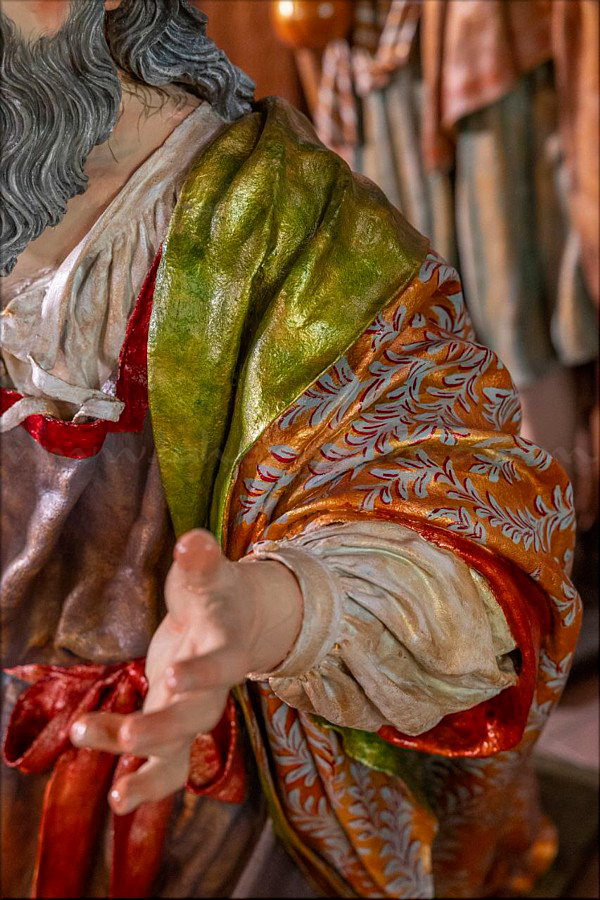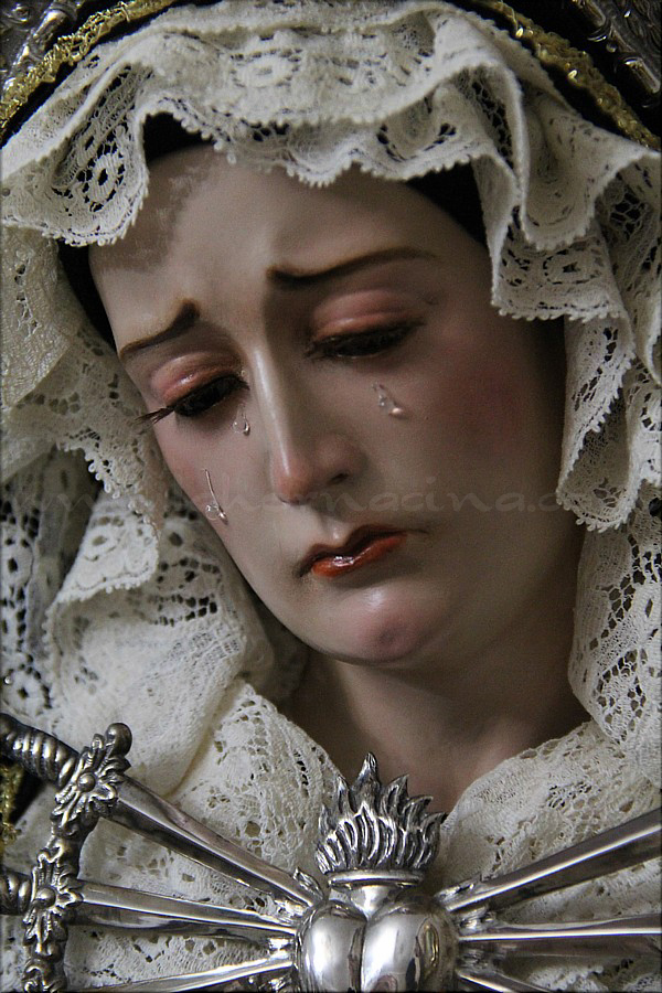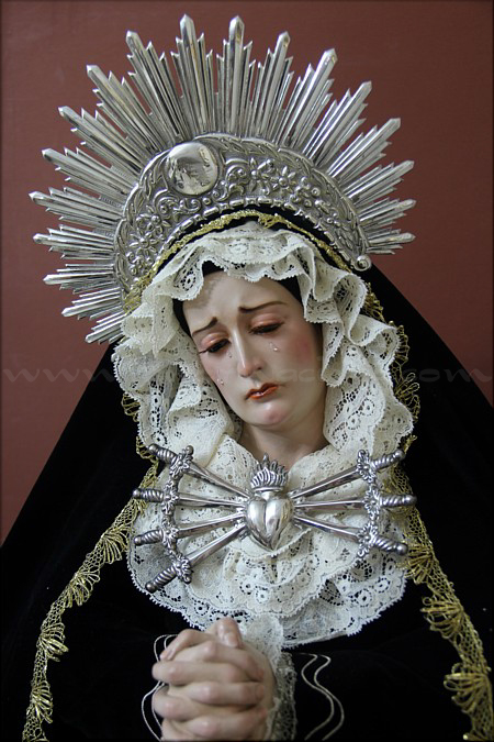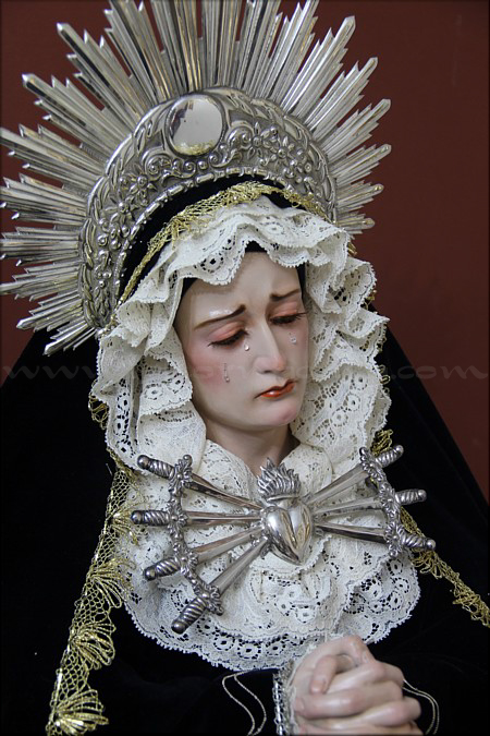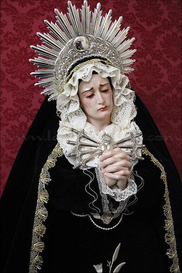 | David San Nicolás Virgen de los Dolores, obra en terracota policromada para una devoción particular en Córdoba, donde recibirá culto en un oratorio privado. Se erige como un tributo a la estética dieciochesca de la Escuela granadina, inspirada en la sobriedad emocional de José de Mora y el dinamismo expresivo de Torcuato Ruiz del Peral. Es una imagen de vestir, con candelero de madera y una altura aproximada de 83 cm. Su mirada, de un realismo sobrecogedor, cobra vida gracias a unos ojos de pasta vítrea soplada. Su encarnadura ha sido ejecutada al óleo mediante la técnica de veladuras, logrando una piel de apariencia natural. Obra del joven escultor David San Nicolás Bouzada (Benidorm, 1999). Esta pieza trasciende el sentimiento para capturar la esencia del duelo materno. Su iconografía se aleja del dramatismo exacerbado para refugiarse en un sollozo contenido y sereno, logrando un equilibrio sublime entre la profundidad del dolor y la paz de la aceptación. |