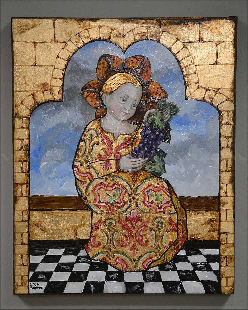 De Lúmine Artistas Plásticos La pintura Niño de Dios con racimo ha sido realizada con acrílico y pan de oro sobre tabla de 27 x 21,8 cm, obra de Francisco Javier Sosa y Manuel Caliani (De Lúmine Artistas Plásticos) que continúan afianzando su apuesta conjunta. El Niño aparece coronado con una aureola de las mariposas llamadas "manto bicolor", sosteniendo un racimo de uvas, sedente sobre un sitial dispuesto sobre un suelo ajedrezado de losas blancas y negras. El último plano lo conforma un fondo de tinieblas. Enmarca la escena un arco enladrillado. Su funcionalidad es llevar al espectador a la contemplación en torno al sacrificio de Cristo, destacando la dulce melancolía con que el Niño contempla el racimo de uvas, símbolo eucarístico de la Pasión. La apuesta de ambos artistas reside en la aproximación y la reinterpretación de las formas estilísticas del arte bajomedieval, en este caso del estilo gótico internacional. Respecto al cartel del LXXV aniversario fundacional de la Hermandad del Sagrado Descendimiento de Huelva, obra en solitario de Manuel Caliani, es una pintura sobre papel adherido a tabla, realizada con acuarela, acrílico y pastel. En ella se disponen sobre una composición eminentemente diagonal los siguientes elementos: el misterio del Descendimiento de Cristo, un lirio morado -símbolo de la dolorosa titular, María Santísima en la Resignación de sus Dolores-, la fachada del Ayuntamiento de Huelva -la Hermandad fue fundada por sus funcionarios en la década de 1950- y el texto. El contraste entre los mismos se logra mediante el empleo de colores complementarios así como con la convivencia de tratamientos y pigmentos diversos. El autor persigue la creación de una imagen atractiva y poderosa, acorde a la modernidad que posee el conjunto escultórico del Descendimiento, obra de Antonio León Ortega. |