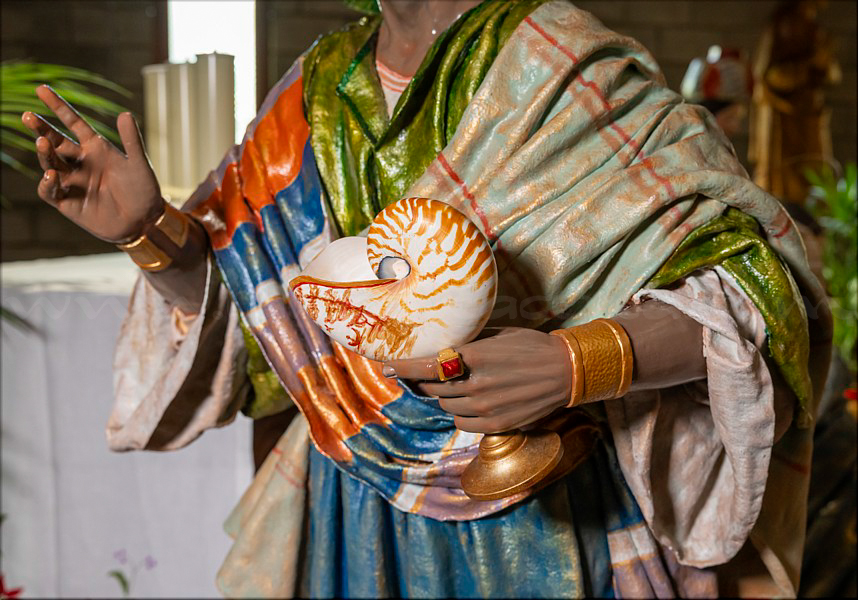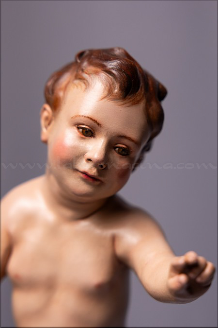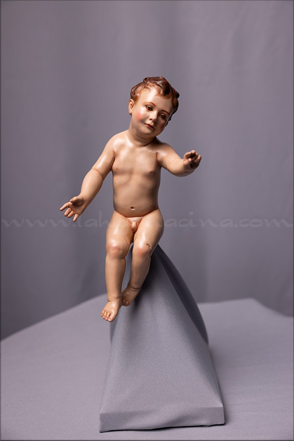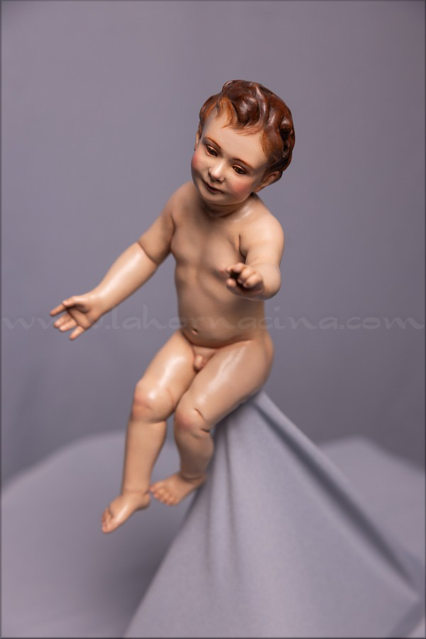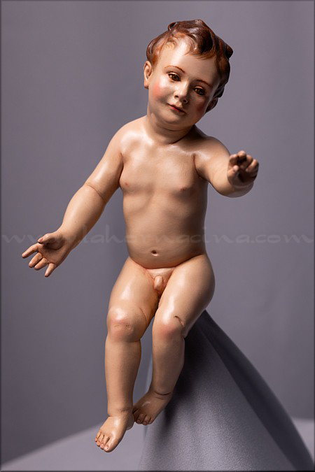 Alejandro Paneque Niño Jesús modelado en terracota policromada al óleo, obra de dimensiones muy reducidas (mide tan solo 20 cm de altura) para una colección particular. El escultor e imaginero malagueño lo ha representado sedente y completamente desnudo, con gesto sonriente y la mano izquierda extendida hacia los fieles. Fotos: Luis Manuel Gómez Pozo. |