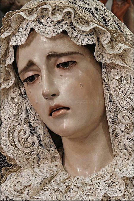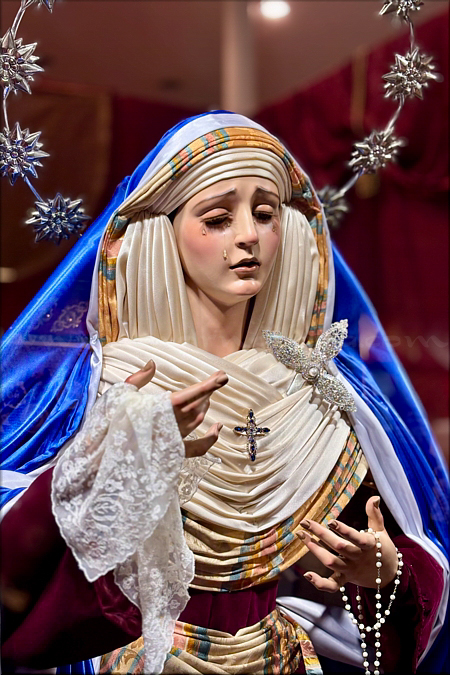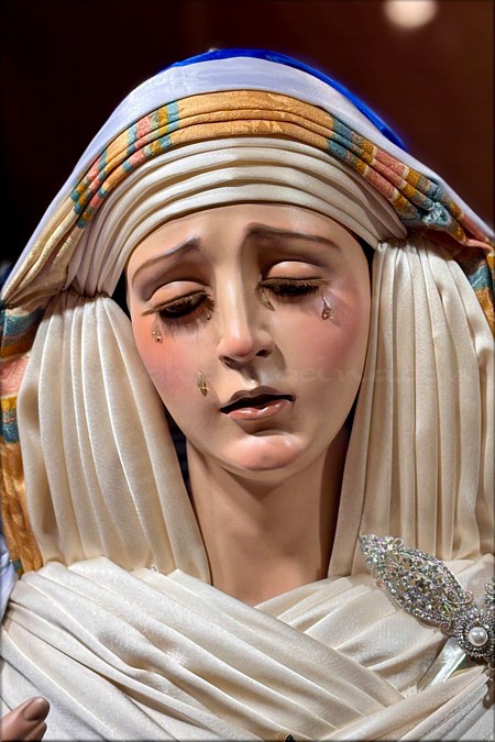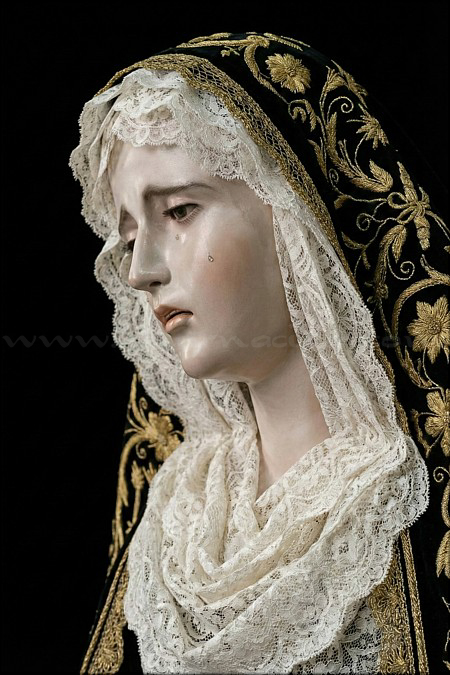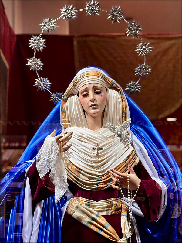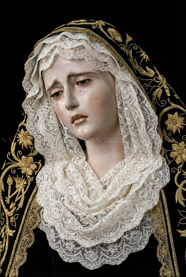 Javier González Castellano Dolorosa con la advocación de María Santísima del Amor, de tamaño natural (mide 168 cm de altura), tallada en madera de cedro real y policromada al óleo por el joven escultor e imaginero, con ojos de cristal realizados a mano para lograr mayor profundidad y realismo en la mirada. Esta obra, disponible para su adquisición, se encuentra expuesta en el escaparate del establecimiento Almacenes Velasco, en el n º 4 de la sevillana calle Chapineros, hasta finalizar la próxima Semana Santa. Ha sido ataviada para la ocasión por el vestidor David Toro Ríos con el popular atuendo de hebrea. |