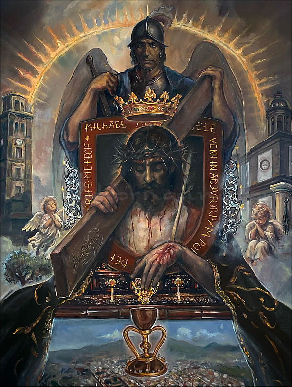 | Ismael Francisco Sánchez La composición del cartel de la Semana Santa de San Cristóbal de La Laguna 2026, en palabras de su autor, constituye una alegoría de todas las cofradías y hermandades de La Laguna. La imagen central representa el escudo de la ciudad. Asimismo, destacan la corona que reposa sobre el Rey de Reyes y, en los laterales, las torres de la Iglesia Matriz de la Concepción y de la Catedral de La Laguna. En la base de los referidos templos encontramos a dos querubines: uno sale del huerto y el otro llora junto a la columna. La figura superior, identificable como San Miguel Arcángel, copatrón de la ciudad, aparece empuñando su mandoble y auxiliando a Cristo elevando la Santa Cruz, estableciendo un vínculo directo con el sentir del pueblo lagunero. La parte inferior del cuadro está dedicada a una panorámica de la ciudad desde la perspectiva del monte de Las Mercedes, en la que podemos divisar, entre otros enclaves, la Plaza del Adelantado y el convento de Santa Catalina. Además, una gota de sangre brota de la mano de Cristo y cae sobre el Santo Cáliz, estableciendo una referencia al sacrificio eucarístico. Según el joven pintor natural de Breña Alta, esta pintura realizada al óleo sobre lienzo (97 x 130 cm) no busca imponer un discurso, sino abrir un espacio de silencio y reflexión donde el espectador pueda reconocerse. |