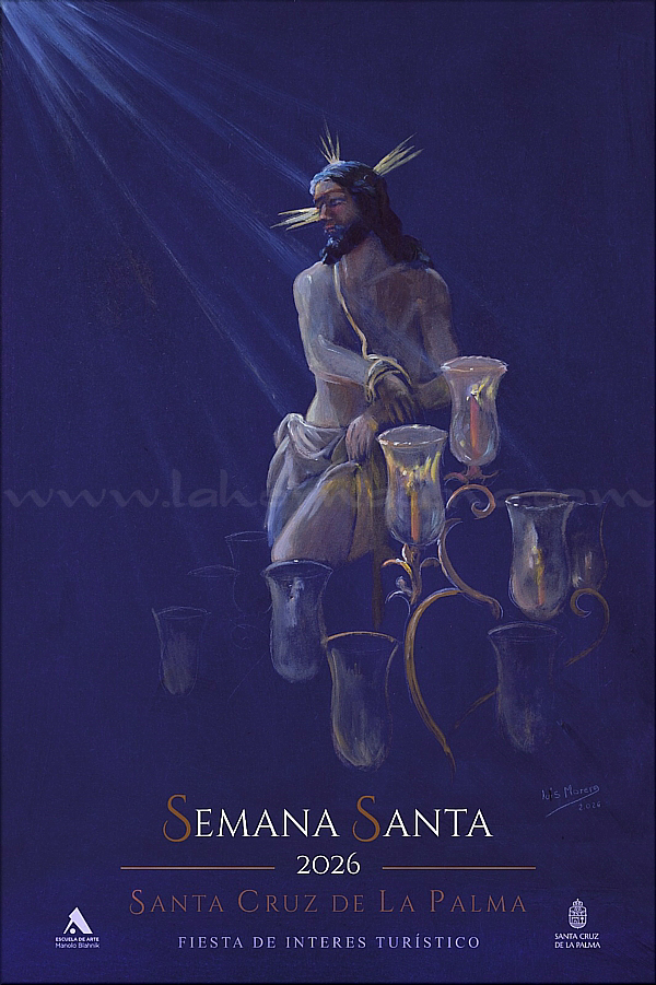 | Luis Morera Cartel de la Semana Santa 2026 de Santa Cruz de La Palma. Esta obra anunciadora lleva la firma del reconocido creador palmero Luis Morera, quien ofrece una pieza que, en palabras de las autoridades eclesiásticas y civiles (Cabildo y Ayuntamiento) presentes en el acto de presentación, supera su función divulgativa para convertirse en patrimonio cultural y en un diálogo entre tradición y contemporaneidad. El gran protagonista del cartel es el Señor de la Columna, la venerada imagen del Martes Santo que recupera este año un protagonismo especial gracias a la mirada artística de Morera. Fue realizada en los talleres madrileños de arte sacro de Manuel Caderot, sufragada mediante suscripción popular y con la aportación de la casa Duque Martínez. La autoría corresponde a Andrés Falcón San José y a Manuel Arriaga Beroa, quien asumió la labor de policromía y acabado. |