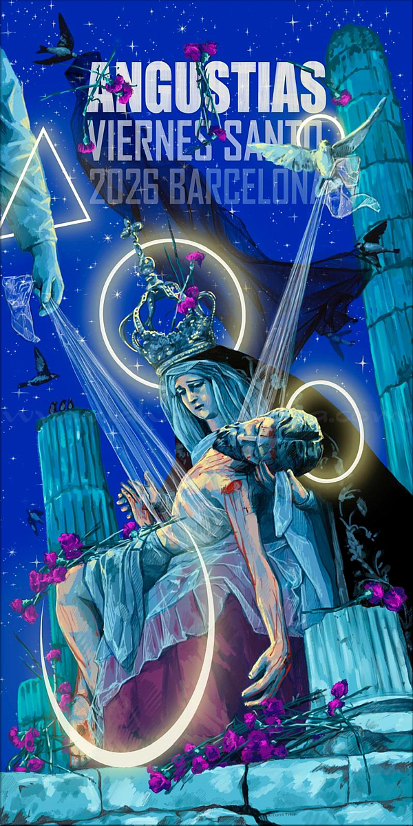 Ricardo Pueyo Cartel anunciador del Viernes Santo 2026 de la Hermandad y Cofradía de Nuestra Señora de las Angustias de Barcelona. En esta pintura digital, la Virgen de las Angustias y el Santísimo Cristo de la Misericordia, titulares de dicha corporación de penitencia, se erigen como el eje de un cosmos que parece detenerse, invitándonos a ser testigos de un instante en el que el tiempo se pliega y el cielo se inclina ante el peso del sacrificio. La escena aparece concebida en visión de contrapicado: una mirada que nos eleva desde el suelo herido hasta la inmensidad de una noche estrellada y onírica. La Virgen no sólo sostiene el cuerpo de su Hijo; sostiene el derrumbe del mundo y el silencio del universo. Ambos reposan sobre un templo partido, arquitectura en ruinas que evoca el Evangelio: el velo rasgado, la tierra que tiembla y el antiguo orden que se quiebra para que la Gracia brote entre sus grietas. La muerte de Cristo no es final, sino la fractura necesaria para que lo eterno alcance al hombre. En la soledad del Calvario, sin embargo, la Virgen no está sola. El autor ha querido plasmar la Santísima Trinidad como un abrazo invisible que desciende a recoger al Hijo. Un Dios que muere sostenido por la Vida Eterna: desde lo alto, el Padre y el Espíritu Santo -mano de luz y ala de paloma- sujetan a Cristo mediante un velo de tul blanco. Las coronas, geometría sagrada resplandeciente, hablan de la divinidad y del orden perfecto que subyace tras el caos de la muerte: la luz de la razón divina iluminando el luto. En el cielo, las golondrinas, conocedoras de espinas, portan en sus picos un luto de gasa negra para arropar a la Madre, mientras una lluvia silenciosa de claveles púrpura cae, se enreda en las letras del cartel, tiñe la tierra y reposa sobre el cuerpo de Cristo. El artista sevillano propone así una ensoñación que evoca el Viernes Santo de la Hermandad de las Angustias en Barcelona: el momento en que el cielo desciende a la tierra. |