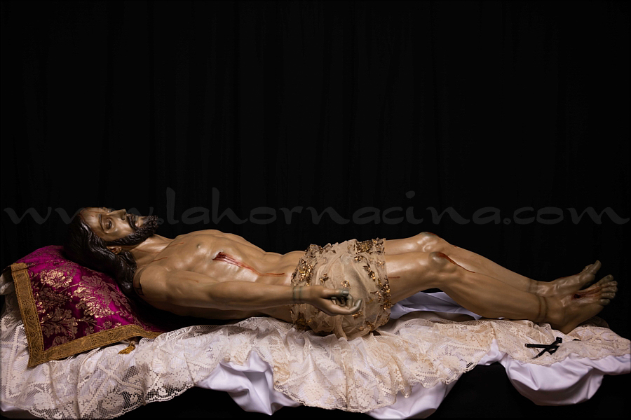 La restauración de Salvo Rabasco ha consistido en la limpieza de la escultura, eliminación de repintes y añadidos, y recuperación de valores cromáticos y escultóricos originales, así como la consolidación de las zonas con riesgo de desprendimiento, reintegración matérica y cromática, y protección final frente a agentes atmosféricos. Asimismo, el restaurador ha estabilizado las articulaciones, pues esta figura de Cristo Yacente sigue siendo utilizada para llevar a cabo la vernácula ceremonia del desenclavamiento y deposición de Jesús en el Sepulcro. |