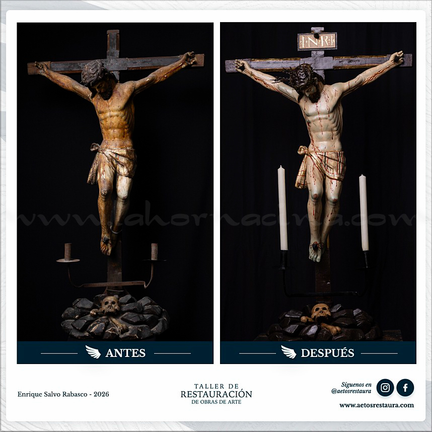 La intervención, basada en criterios de mínima actuación, reversibilidad y respeto por la materia original, consistió en la limpieza progresiva, que permitió recuperar la policromía original del conjunto y el estofado original del perizoma, consolidación estructural puntual, reintegración volumétrica limitada y reintegración cromática mediante técnicas discernibles, culminando con una protección final estable. Los trabajos se extendieron igualmente al conjunto del Calvario, abordándose la conservación del monte, la calavera y la cruz, elementos que presentaban alteraciones cromáticas, depósitos de suciedad, oxidaciones y pérdidas materiales, procediéndose a su limpieza, consolidación, reintegración cromática y estabilización estructural, garantizando así la correcta lectura unitaria del conjunto. La atribución a la escuela sevillana del último tercio del siglo XVI se fundamenta en la tipología anatómica, el tratamiento sereno del rostro, la concepción compositiva y los recursos técnicos empleados, con claros paralelos en obras del entorno de Jerónimo Hernández, Gaspar del Águila y Andrés de Ocampo, figuras clave del Manierismo sevillano. La síntesis entre idealización renacentista y naturalismo incipiente sitúa la obra en un momento de transición estilística, propio del foco escultórico sevillano de finales del Quinientos. La presente restauración de Salvo Rabasco ha permitido revalorizar un conjunto escultórico de notable calidad, devolviéndole su integridad material, cromática y estética, así como facilitar su correcta lectura histórica. Nos hallamos ante un Cristo Crucificado de alto interés patrimonial, representativo de la evolución de la escultura sevillana en el tránsito hacia el primer naturalismo barroco. |