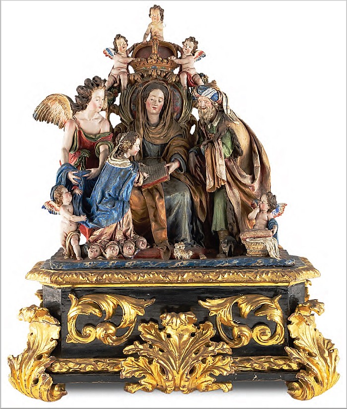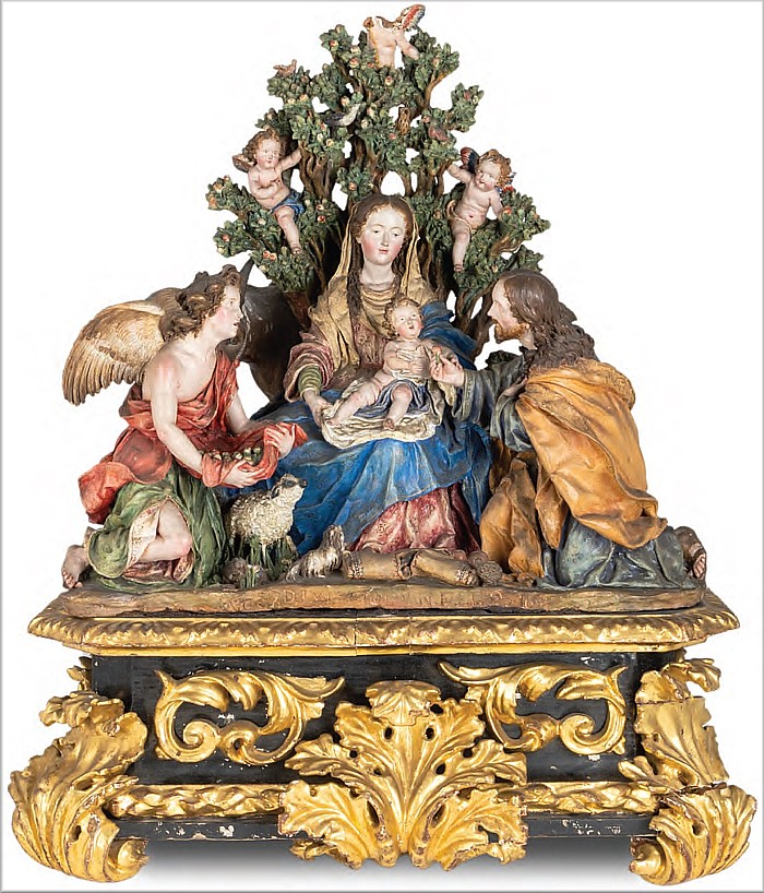 Las esculturas que subasta la casa madrileña Abalarte, inéditas en el mercado y bien conocidas en diferentes publicaciones, tienen además la particularidad de estar una de ellas firmada y fechada, por lo que podemos datar también el otro grupo, en 1691, un año antes de ser nombrada Escultora de Cámara. Estos pequeños grupos de terracota policromada, que demandaban particulares para uso devocional privado, tanto aristocrático como conventual, tuvieron mucho éxito y se conservan tanto en colecciones nacionales como extranjeras. Fueron definidos por la propia Luisa Roldán como "alhajas de esculturas" y tienen una complejidad iconográfica muy destacable, presentándose las figuras como una Sacra Conversazione de clara influencia italiana, con una policromía muy en relación con el naturalismo de Murillo y una expresión plástica de gran ternura maternal, delicadeza y cercana sensibilidad según las directrices del Concilio de Trento. Uno de los grupos, titulado La Virgen aprendiendo a leer (imagen superior), representa el pasaje de La educación de la Virgen a cargo de Santa Ana, figurando también en la escena San Joaquín, un arcángel y tres querubines, sin contar las cuatro cabezas aladas que sirven de escabel a María. Aparecen también un perro, un gato y un costurero, mezclando de forma incomparable, como lo hacía la artista sevillana, lo divino con lo cotidiano. La base es de madera tallada ebonizada y dorada, viniendo a medir con ella 70 x 31 x 59 cm. El otro grupo, que es el que se halla firmado y fichado, se titula Descanso de la huida a Egipto (imagen inferior). El Niño aparece sobre pañales en el regazo materno. Madre e Hijo se hallan descansando delante de un árbol -del que surgen varios pajarillos y tres gozosos querubines, uno de ellos descabezado- y son adorados por San José y un arcángel arrodillados. Completan la escena el asno que les sirve de montura, un perro, una cabra y un cordero. Firma y fechan se hallan inscritas claramente al frente. Posee una base similar al anterior, viniendo a medir con ella 70 x 30 x 60 cm. El precio de salida de cada grupo es de 275.000 euros. Ambos aparecieron publicados y referenciados por el conde de Güell, Francisco Javier Sánchez Cantón y María Victoria García Olloqui. La sesión de la subasta tendrá lugar para estas piezas el 4 de diciembre a partir de las 17:00 horas. La exposición de todos los lotes en sede (Calle Juan Bravo 46, Madrid) comenzará mañana, 21 de noviembre, y se clausurará el 3 de diciembre, siendo el horario de 10:00 a 14:00 y de 16:00 a 19:00 horas (lunes a sábado). |