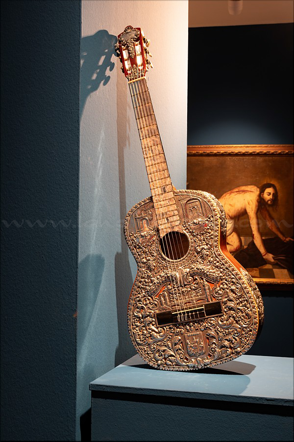 Junto a los estrenos podemos admirar en la exposición, comisariada por Ignacio Sánchez Rico, piezas clásicas pertenecientes al patrimonio de la Hermandad del Baratillo, como el cuadro fundacional de la Piedad, atribuido al pintor Sebastián Millán (hacia 1700), seguidor de Murillo. Se trata de un óleo sobre lienzo con bastidor de madera cuyas dimensiones son 258 x 155 cm. Está terminado en su parte superior con forma de arco de medio punto para encajar en el altar mayor, que realizó el maestro Juan Fernández de la Iglesia. También se exhibe la obra Cristo de la Púrpura, pintura anónima de finales del siglo XVII o principios del XVIII que representa a Cristo recogiendo sus vestiduras después de ser flagelado. Hablamos igualmente de un óleo sobre lienzo con bastidor de madera, en este caso de 88 x 155 cm. En el plano escultórico podemos mencionar las tallas en madera policromada al óleo de la Virgen de Belén, un busto del siglo XVIII atribuido al célebre escultor e imaginero sevillano barroco Benito de Hita y Castillo, y el Cristo crucificado de tamaño inferior del natural, obra anónima del siglo XVII. Una pieza que llama especialmente la atención del público visitante es la magnífica guitarra ornamental (1979) en plata de ley repujada y cincelada, regalo del Ayuntamiento de Sevilla al cantautor local Francisco Palacios (El Pali) como homenaje de la ciudad a una amplia trayectoria consagrada al cante flamenco, en especial a las tradicionales sevillanas. Pieza cincelada por el taller Orfebrería Triana que muestra en el dorso un relieve con el palio del Baratillo a las puertas de la capilla. |