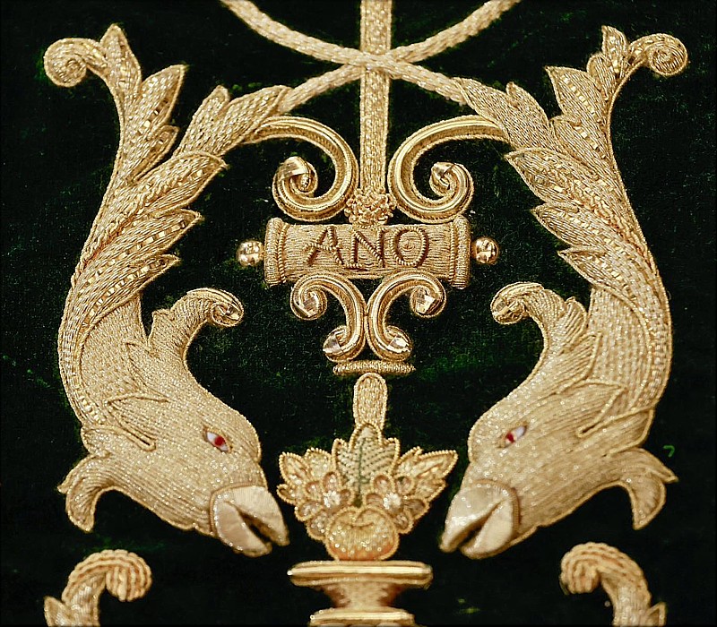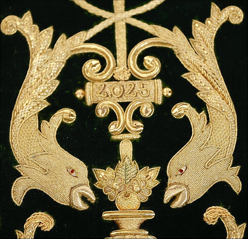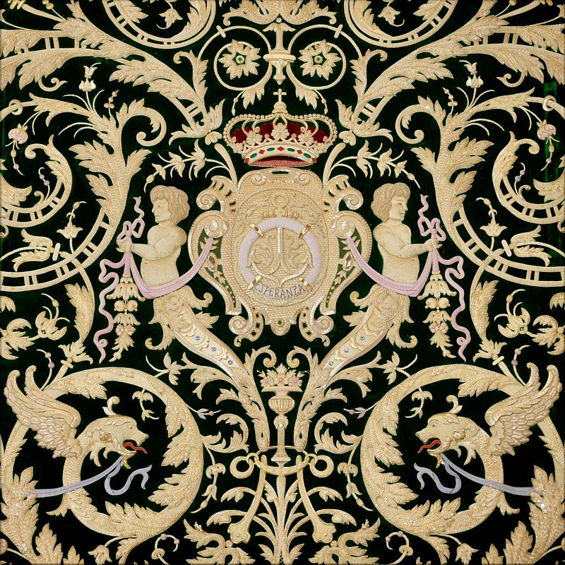 El pasado 28 de septiembre la Hermandad presentó el estreno de un nuevo manto cuya ejecución ha corrido a cargo del taller de Pepi Maya, discípula de Esperanza Elena Caro, que ha sabido mantener las enseñanzas de su maestra, manteniendo las técnicas tradicionales del bordado en oro sevillano, destacando la pulcritud de sus acabados y el clacisismo y la armonía en la distribución de los puntos. Esta nueva pieza se inspira en el manto diseñado por Recio en 1909. Su diseño, retomando el dibujo del "manto de los dragones", se le encarga a Javier Sánchez de los Reyes, dando como resultado una pieza que recrea la personalidad única de aquella prenda. Partiendo de la citada inspiración, la nueva obra mantiene el estilo de Recio, con amplitud en el movimiento y en la escala de sus motivos vegetales, pero aporta un dibujo original y renovado. En el centro se sitúa una cartela coronada con el áncora y el salvavidas entrecruzados, emblema de la Hermandad desde comienzos del siglo XX, con la palabra ESPERANZA en su parte central. En torno a ella se desarrolla un rico repertorio ornamental inspirado en la cerámica trianera de Recio, documentado en diversas piezas conservadas del autor, como el zócalo de una casa señorial en la calle Águilas firmado en 1912. Destacan los tallos dobles unidos por travesaños, a modo de "escaleritas", característicos de la producción de Recio, así como los ángeles fitomórficos -mitad humanos, mitad vegetales- y otros seres fantásticos como delfines o dragones, todos ellos asociados tradicionalmente a la protección de lo sagrado y muy presentes en la ornamentación manierista reinterpretada por la cerámica sevillana. El nuevo manto incorpora un completo repertorio de técnicas de bordado en oro, con especial riqueza en cartulinas, hojillas, matizados en sedas o giraspes y grandes piezas de tejido que componen el conjunto. Finalmente, se remata con una blonda de diseño exclusivo, de gran anchura y perfecta adecuación a la monumentalidad del manto, la cual ha sido confeccionada por Alfonso Aguilar. |