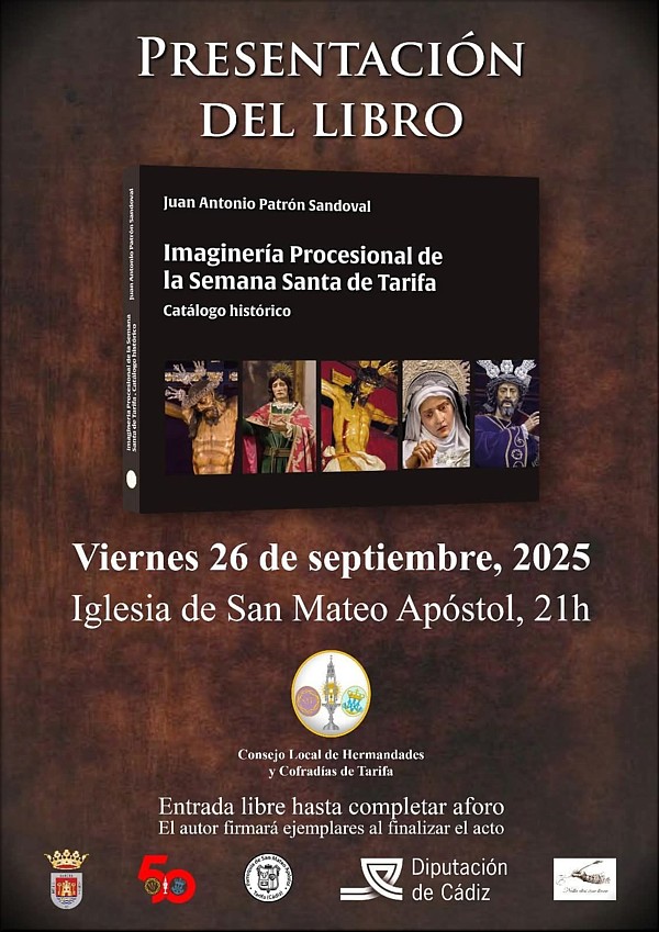El Consejo Local de Hermandades y Cofradías de Tarifa, dentro de las actos programadas por su 50 Aniversario, organiza la presentación de Imaginería procesional de la Semana Santa de Tarifa. Catálogo histórico (Imagenta Editorial), una publicación que ha sido encargada por dicha institución al historiador tarifeño Juan Antonio Patrón Sandoval. La presentación tendrá lugar en la Iglesia de San Mateo el próximo viernes 26 de septiembre a las 21:00 horas, con entrada libre hasta completar aforo. El autor del libro firmará ejemplares al finalizar el acto. Según el Consejo este catálogo no dejará indiferente a nadie, pues trata de ser una obra divulgativa, que reúne información rigurosa y detallada de manera muy didáctica, sobre las imágenes que han procesionado en la Semana Santa tarifeña a lo largo de la historia. No es solo una herramienta para curiosos, investigadores e historiadores, sino que está especialmente dirigida a los cofrades tarifeños con el fin de que les ayude a valorar y comprender la importancia de preservar el patrimonio artístico y religioso que custodian. |