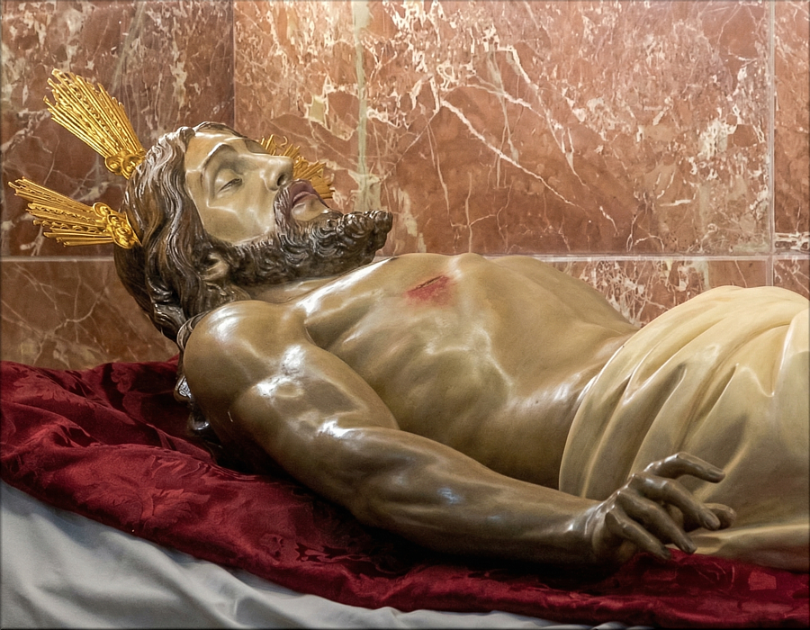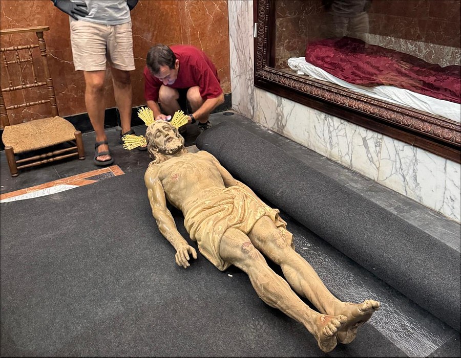 El proceso de limpieza fue el más complejo de toda la intervención, llevándose a cabo en dos fases: una primera limpieza mecánica para eliminar los depósitos más densos y adheridos, y una segunda limpieza fisicoquímica para retirar la suciedad restante sin afectar a la policromía. Se consolidó el estrato pictórico en las zonas de descohesión y se reintegró volumétricamente la pequeña pérdida en la falange de la mano derecha del Cristo. Posteriormente se estucaron las pérdidas de película pictórica y se realizó la reintegración cromática de dichas perdidas en dos fases de intervención: una primera de entonado con colores al agua y una segunda de retoque con colores al barniz. Finalmente, se aplicó un barnizado puntual con una resina sintética estable de bajo peso molecular. Debido a que el Cristo Yacente se encontraba totalmente cubierto de barro y suciedad como consecuencia de la inundación del templo en el que se encontraba, lo que incluso conllevó la perdida de intensidad del color, una fotografía tomado del mismo en ese estado se viralizó y se convirtió en símbolo de la tragedia patrimonial del suceso, hasta el punto de ser apodado "Cristo del Fango" por la ciudadanía. |