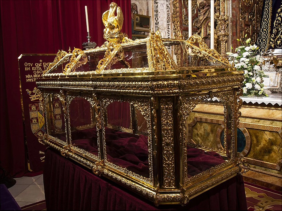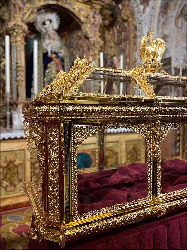 En 2003, la Hermandad de la Soledad, de Olivares (Sevilla), recuperó para su cortejo procesional el paso del Santísimo Cristo Yacente, que se realizó reutilizando elementos anteriores y realizando unos nuevos respiraderos y faldones, recuperación que culmina este año con el estreno de una nueva urna procesional. La nueva urna respeta el tamaño y proporciones de la anterior y ha sido labrada en orfebrería dorada por los talleres sevillanos de Orfebrería Villarreal, siguiendo un diseño de Francisco Villarreal, que ha tomado como fuente de inspiración los cuatro faroles dorados que actualmente alumbran la imagen del Cristo Yacente en su paso y que fueron realizados por José Jiménez en 1982. De estructura rectangular, la composición de la urna se conforma por varios marcos: tres por cada costado y uno tanto en su parte frontal como trasera. Estos marcos, de forma rectangular y arco bajo en su parte superior, llevan decoración de roleos y acantos, siendo esta ornamentación calada para facilitar lo máximo posible la visión del Cristo, una talla de autor anónimo fechada en el siglo XV. Los marcos quedan enmarcados por moldura alta, baja y pilastras dónde se pueden observar ménsulas a juego con los que tienen los citados faroles del paso. La parte superior, a modo de tapa, posee estructura trapezoidal y queda enmarcada por una fina cenefa ornamentada que sostiene los cristales, siendo rematada por la imagen del pelícano abriéndose el pecho para alimentar a sus crías con su sangre, como símbolo eterno del amor de Cristo. |