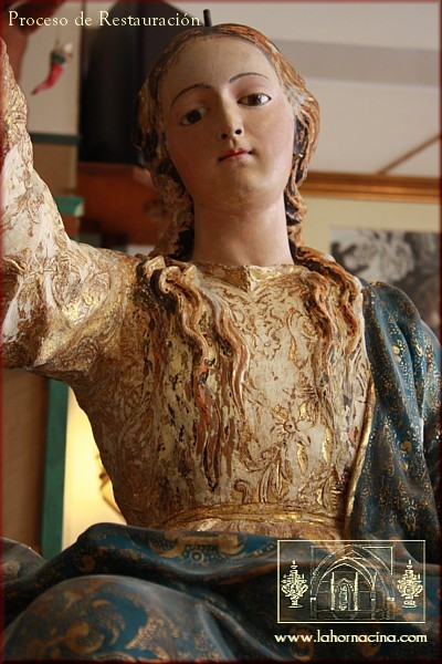 El estado de la imagen mariana era muy deficiente, ya que gran parte de la misma, sobre todo la zona de los ropajes, había sido reestucada y estofada de nuevo con resultados muy desafortunados, hasta el punto que apenas se ha podido recuperar el color original en las vestiduras. Afortunadamente, el estucado primitivo, de excelente factura, se conservaba bajo todos los añadidos, por lo que Francisco Romero Zafra ha podido aplicar sobre el mismo una nueva policromía y estofados en oro fino que siguen las pautas de los originales gracias a los pocos fragmentos conservados. La cabellera de la Virgen también ha tenido que ser policromada de nuevo. En cambio, las carnaciones de María y los angelitos de la peana que la sustentan son las originales en un 90-95% de la hechura, limitándose el escultor e imaginero cordobés a fijarlas y a reintegrar las leves pérdidas pictóricas que presentaban.