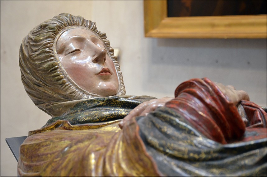 Esta talla en madera policromada de María, acostada, con los ojos cerrados, las manos entrelazadas sobre el pecho y la cabeza envuelta en una severa toca monjil, constituye un dulce y, a la vez, impresionante simulacro de la Virgen muerta. El efecto se ve acentuado por el espectacular realismo de ciertos detalles, en particular la recreación de las carnes realzada por una policromía particularmente bien conservada. Es una obra anónima de tamaño natural (162 x 47 cm) que actualmente se conserva en el Museo de Bellas Artes de Lyon (Francia). Consta documentalmente su adquisición en el año 1889. La Virgen se halla representada en el llamado "sueño de la muerte" por la piedad cristiana, durante los momentos previos a su Asunción a los cielos. En su origen, la figura yacente se encontraba seguramente rodeada por un grupo de imágenes que representaban a los apóstoles en actitud orante. Hablamos de un tipo de obras raro de ver en las colecciones públicas francesas. Esta en cuestión se cataloga a finales del siglo XVI y ha sido relacionada con el foco renacentista burgalés de la época. El Renacimiento fue una época de florecimiento cultural en la ciudad de Burgos bajo esquemas de mayor libertad compositiva, estética y, sobre todo, temática. A lo largo de este período, hubo un gran desarrollo de diversas artes. |