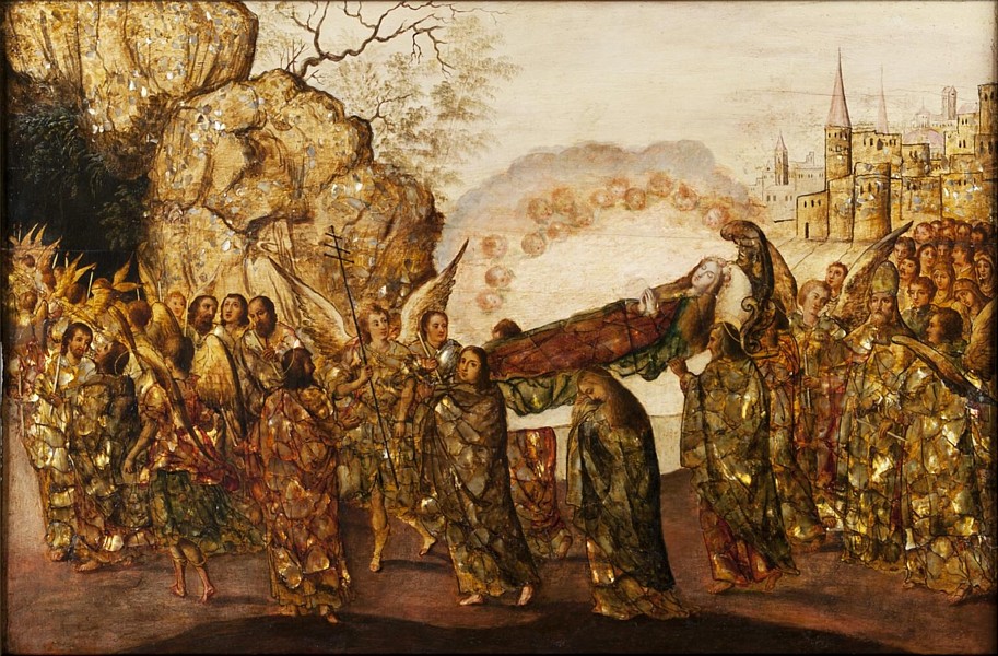 Desde principios del siglo XX, el estudio de las pinturas incrustadas de concha (hacia 1650-1750) se ha ligado a Miguel González y, en menor medida, a Juan González, artistas de los que se sabe poco, pero cuya importancia en relación con estas obras es difícil sobrestimar. Ambos trabajaron en Ciudad de México a finales del siglo XVII y principios del XVIII. Su producción fue nutrida, pues entre los dos firmaron cerca de la tercera parte de las más de 250 obras que se conocen, y algunas de las aproximadamente 160 tablas anónimas que se conservan asimismo deben ser suyas. Si bien ciertos autores han creído que fueron hermanos, en realidad no fue así, aunque sin duda ambos pintores estuvieron emparentados. Desde 1990 se ha sugerido que los González fueron una familia de inmigrantes asiáticos, chinos o japoneses. En la Nueva España del primer tercio del XVII hubo inmigrantes japoneses, quienes quizá hayan comenzado las experimentaciones que dieron lugar a estas pinturas. Numerosos inmigrantes asiáticos, sobre todo japoneses, se casaron con individuos de distintos orígenes nacidos en la Nueva España y algunos alcanzaron una posición social media e incluso alta. Debido a que la génesis de las pinturas incrustadas de concha no está ligada a ninguna de las familias conocidas del gremio de pintores, sino a unos González de los cuales apenas existe información, la hipótesis sobre su origen japonés resulta muy sugerente. Sin embargo, la relación entre dichas pinturas y las lacas japonesas se produjo en el campo de las apropiaciones y no dependió del origen de sus autores. Es decir, los González podrían no haber tenido ascendencia japonesa. Bien pudo haberse tratado de una familia novohispana que, sin tener origen japonés, hubiera aprovechado el gusto local por las lacas "namban" para experimentar con el material orgánico y los diseños de dichas obras, pero usando técnicas, materiales, soportes y contenidos iconográficos de origen europeo. En líneas generales la técnica del enconchado consiste en la colocación sobre un soporte de madera de una capa de lienzo o bandas del mismo, aunque tenemos casos en los que la pintura va directamente sobre la tabla. Posteriormente, se realiza la base de preparado con yeso aglutinado con aguacola, capa sobre la que se ejecuta el dibujo preparatorio que servirá como guía en la colocación de las conchas y la posterior aplicación de las lacas. Una vez pegadas las conchas con cola animal, de manera que quedan incrustadas en la base de preparación sin sobresalir de la misma, se realizan los trazos de la composición en tinta china de diferentes saturaciones, dibujo que da forma a las figuras y objetos y que podemos ver con claridad a través de las lacas. El paso final es el de colorear la imagen con distintos tonos de lacas, y sobre ellas se aplica la capa de barniz, que con el tiempo ha adquirido un tono amarillento, otorgando un aspecto característico a esta clase de pintura. Estos materiales, y la forma de aplicarlos, nos recuerdan la pintura venida de Oriente, donde a la decoración de nácar y al empleo de lacas traslúcidas se unen unos pasos de ejecución y una composición formal que podemos encontrar en tratados de pintura europeos fechados en siglos anteriores a los enconchados. Ello en parte es debido, como hemos señalado, a la presencia de artesanos y objetos llegados de China y de Japón en Nueva España. En el Museo de América (Madrid) se encuentran 84 tablas enconchadas de diversos temas. Esta colección es uno de los máximos y mejores exponentes de la técnica de enconchados, junto a la del Museo Nacional de Bellas Artes de Buenos Aires y el Museo Nacional de Historia de México, además de varias colecciones particulares en México y España. Una de esas tablas, el Traslado del cuerpo de la Virgen, pertenece a una serie de 12 tablas sobre la vida de María, que han sido atribuidas a Miguel o Juan González. La serie fue realizada en torno a 1690-1710 y cada una de las tablas mide 61 x 86 cm. Los orígenes iconográficos los encontramos en la Legenda Aurea (Leyenda Dorada), cuando habla de un conjunto de miles de ángeles que rodearon el cadáver de María para tomarlo en sus manos, resucitarlo y escoltarlo al cielo. Aquí en esta pieza lo anterior se mezcla con la iconografía tradicional del Traslado al sepulcro de Cristo, de ahí la presencia de apóstoles como Juan y la Magdalena y otros personajes terrenales, que acompañan a los espíritus angélicos hacia una gruta en la roca fuertemente relacionada con la sepultura de Jesús. |