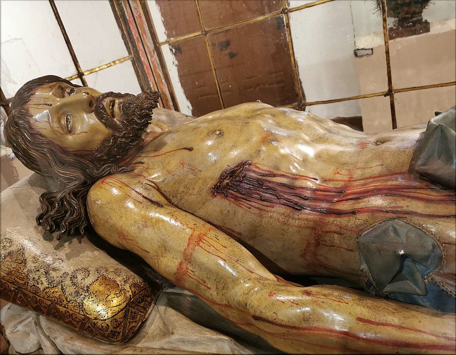 Fue Sáez González quien halló en el archivo conventual de las Madres Clarisas de Monforte de Lemos (Lugo) una documentación que confirmó la autoría de Fernández de dos obras que se encuentran en el Museo de dicho convento: el Cristo Yacente y la Inmaculada Concepción. Las dos obras fueron estudiadas por Martín González, atribuyéndolas a Fernández por analogía con otras piezas del autor. El encargo de ambas piezas lo realizó doña Catalina de la Cerda y Sandoval, viuda de Pedro Fernández de Castro, VII conde de Lemos, cuando se encontraba en la Corte, antes de regresar definitivamente a Monforte de Lemos en noviembre de 1629. En esta villa ingresó de monja en el convento de Santa Clara, fundado por ambos esposos, y a él legó estas y otras maravillosas obras que se hallan en el museo y convento. El Yacente es uno de los mejores que realizó el escultor cuando se encontraba en la plenitud de su creación artística y transmite cabalmente a los creyentes el tema de la pasión de Cristo. Es además el único de la serie tallado por Fernández de forma exenta, sin el cuerpo adherido al sepulcro. Presenta un gran realismo ya que Fernández cuida con gran esmero los detalles. Sus ojos, entreabiertos, son de cristal. Su boca, entreabierta dejando ver los dientes de marfil, parece estar exhalando el último suspiro. Las uñas de pies y manos son postizas de asta de bovino. El cabello, muy cuidado, presenta una especie de mechas teñidas de un rubio más intenso que el resto del pelo. El paño de pureza está realizado con tela encolada, con los típicos pliegues "metalizados" del autor, llamados así por pronunciados y angulosos. |