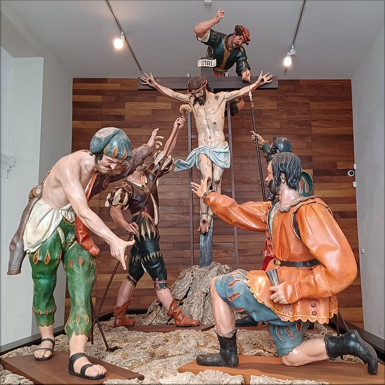 Sed Tengo, también conocido como Paso Grande, es el primer conjunto escultórico de Fernández para las procesiones de Semana Santa. Fue realizado entre los años 1612 y 1616 por encargo del gremio de los pasamaneros, con destino a la cofradía vallisoletana de Jesús Nazareno. Recoge dos pasajes iconográficos descritos en el evangelio de Juan: la llamada "quinta palabra" de Jesús, representado por el Crucificado y el verdugo al pie de la cruz que le ofrece la esponja empapada con hiel y vinagre, y la rifa de la túnica de Cristo echándola a suerte con los dados, representado por los dos sayones que aparecen en la delantera del paso. A ellas hay que sumar otro verdugo al pie de la cruz sujetando una lanza, y el que, subido a una escalera, clava la tablilla con el rótulo INRI a un madero de corte liso y rectangular. El Cristo es una bella obra propia de la etapa inicial de Fernández, influenciada todavía por el arte manierista de los Leoni. Magnífico es el grupo de los verdugos, llamados también sayones, especialmente el que sostiene la esponja y el que señala a los dados, cuya inspiración puede hallarse en un grabado del flamenco Johan Sadeler. Todas ellas son de unas dimensiones superiores a las reales. En la escena vemos también la indumentaria a la moda de la época, propia de los pasos de Fernández, que imprime además a los verdugos la caricaturesca fealdad heredada del arte medieval. A ello hay que sumar la impecable anatomía, el dinamismo de las poses, los expresivos gestos y la inestabilidad que provoca la figura del verdugo que coloca el INRI, muy transgresora en su tiempo por situarse por encima de la cruz. El traslado de la cofradía de su sede fundacional, el convento de San Agustín, a su propia iglesia penitencial, motivó que se perdieran las imágenes del Crucificado y los verdugos del INRI y de la esponja. La desamortización del cenobio y el posterior traslado de las tres figuras al Museo Nacional de Escultura hizo posible que la cofradía las recuperase para el paso procesional, quedando de esta forma reintegrado todo el conjunto de Fernández. |