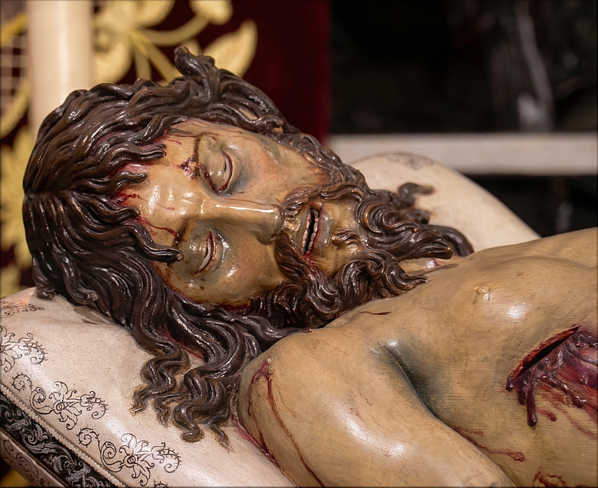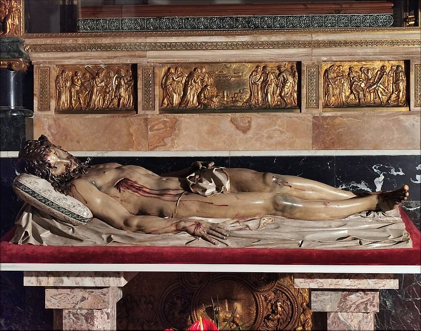 Donación del rey Felipe III al convento capuchino del Pardo de Madrid. Se barajan dos fechas posibles para concretar su hechura. Según los cronistas de la orden, fue en 1605, coincidiendo con el nacimiento en Valladolid de Felipe IV, cuando el monarca resolvió encargar al famoso escultor Gregorio Fernández la talla de un Cristo yacente en el sepulcro. El ordenó ubicarla en su palacio de Valladolid, trasladándola al año siguiente con el cambio de Corte a su oratorio madrileño. En 1615, la entregó a los capuchinos del Pardo para ofrecerle un culto público. Contrario a esta teoría, el historiador Martín González, avalando la imagen como encargo real, retrasó la fecha de su ejecución de 1605 a 1615. Para tal estimación se basó en el hallazgo en el Archivo de Simancas de una Carta de Tomás de Angulo al Duque de Lerma, con fecha de 30 de enero de 1614, en la que se cita "un Cristo para el Pardo que se encargará a Rodríguez de Valladolid". No sería difícil suponer que, por error de Angulo, se tratara de Fernández y no Rodríguez. Si el encargo se fijó en 1614, sería posible que finalizara su ejecución en 1615, coincidiendo de esa forma con la ceremonia de colocación del yacente en la iglesia del Pardo un viernes de marzo de tal año, según el padre Anguiano. Al igual que la mayoría de los yacentes de Fernández, hablamos de un relieve concebido para ser visto por un solo punto de vista lateral. Plantea a Cristo tumbado sobre una sábana tallada, con la cabeza recostada hacia la derecha y acomodada sobre uno o dos almohadones. Sobresale la pierna izquierda sobre la opuesta. Se halla ahuecado por el reverso para salvarlo de los movimientos estructurales de la madera y aliviar su peso. El modelado del Cristo yacente del Pardo revela profundos conocimientos anatómicos, siendo su cabeza una de las más logradas y bellas de la escultura barroca española. Mide 160 cm y su policromía está realizada al óleo. Se aprecian en esta obra peculiaridades formales de transición entre el lenguaje manierista y los modelos de gran realismo. Por un lado, rasgos manieristas son su robusta anatomía y la suave línea serpentinata que retuerce sobre sí mismo el cuerpo desde los pies a la cabeza. Es también un carácter distintivo que el gesto de su rostro no advierta aún los caracteres cadavéricos de futuras tallas, como las cuencas hundidas o los pómulos afilados. El tratamiento del cabello tampoco es tan definido como en sucesivas piezas, basándose su dibujo en amplios mechones apenas calados. La policromía sí ha evolucionado hacia una técnica mate desterrando el pulimento, pero aún sin magnificar el patetismo mediante abundantes regueros de sangre ni livideces. Todavía Fernández no emplea dientes de marfil ni uñas de asta, pero sí introduce recursos realistas como ojos de cristal, corcho y gotas de vidrio rojo en los coágulos de sangre, una espina atravesando una ceja y un cíngulo cordífero amarrando el sudario (última vez que pondría en uso). |