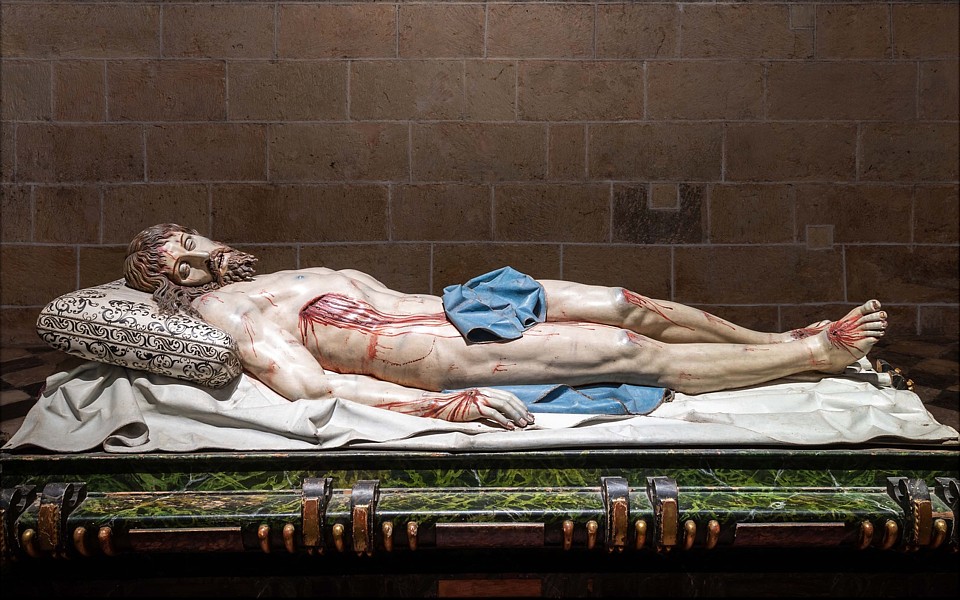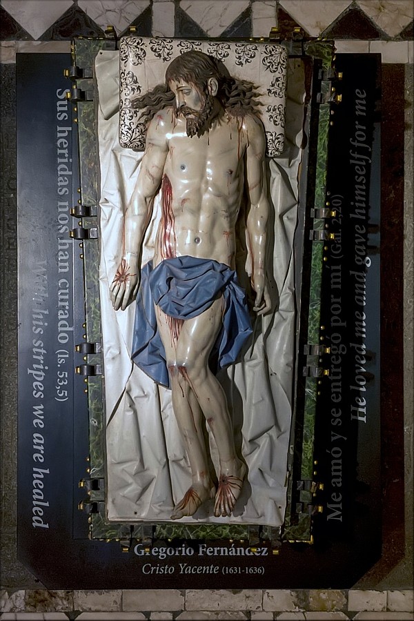 Este Yacente fue realizado por Gregorio Fernández en la última etapa de su vida, entre los años 1631 y 1636. Se encuentra ubicado actualmente en el centro de la capilla del Santísimo Cristo Yacente de la Catedral de Segovia, también conocida como capilla del Descendimiento. La talla, en madera policromada, fue realizada para ser contemplada lateralmente en el banco del retablo de la capilla, como complemento escultórico de las pinturas de la Crucifixión y el Descendimiento del pintor madrileño Francisco Camilo. En este Cristo apreciamos un perfecto tratamiento de la anatomía humana. Un cuerpo esbelto realizado con gran realismo, detallismo y minuciosidad. Unas proporciones admirables que reflejan esa exaltación gozosa de la belleza corporal, propia del periodo clásico. A la vez, plasma ese drama del momento que marca el periodo barroco y llama a la emoción, al sentimiento, a conmover el alma de la persona que lo contempla. Esto último lo vemos enfatizado en la sangre que mana de sus heridas y en el rostro, con los ojos hundidos y entornados y la boca entreabierta. A este realismo de la imagen contribuye la utilización de los postizos, como los ojos de cristal, los dientes de marfil, las uñas de cuerno y fragmentos de corcho y resina para las heridas. Se pueden ver otras características que definen el trabajo de Gregorio Fernández, como la realización en mechones individualizados del cabello y de la barba, así como los pliegues angulosos del paño de pureza y el sudario. Encargado por Melchor de Moscoso y Sandoval (1624-1632), obispo de Segovia, el Yacente, cuyas medidas son 190 x 75 cm, ha participado en exposiciones importantes como Las Edades del Hombre y la gran muestra del Siglo de Oro español celebrada en Múnich (Alemania) entre 2016 y 2017. También procesiona por las calles segovianas el Viernes Santo con motivo de las procesiones de Semana Santa. |