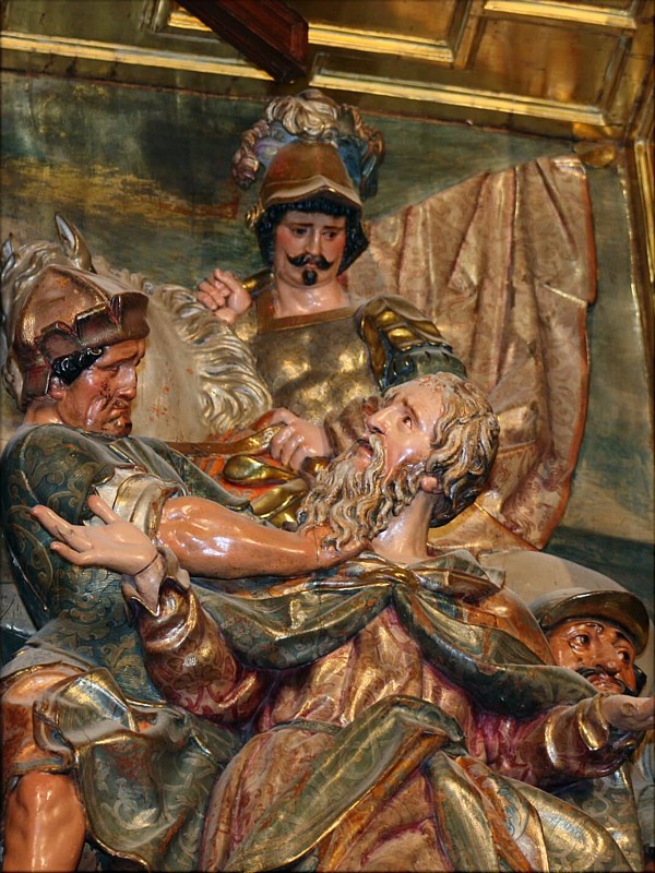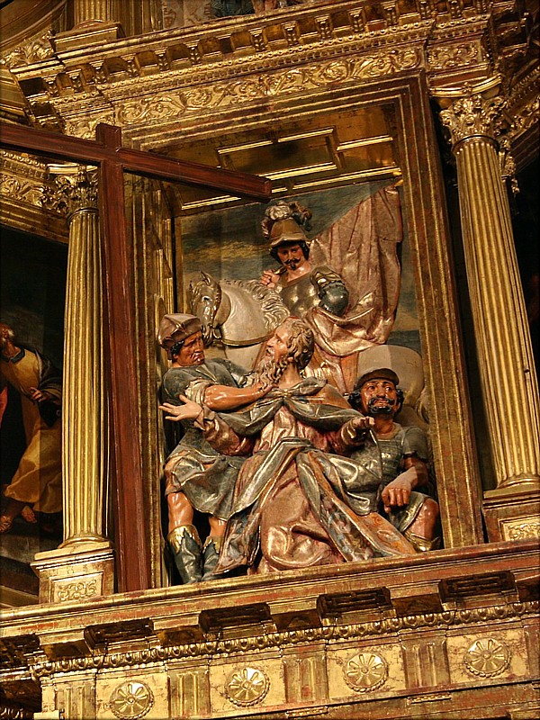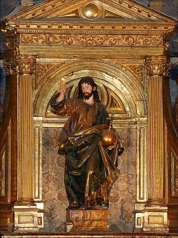 En el ático del retablo mayor de la parroquia segoviana de San Andrés encontramos un grupo de imágenes de bulto redondo que salen de la caracterización narrativa, siendo más propiamente alegóricas. Se trata de la magnífica talla de El Salvador, obra de Gregorio Fernández, y de las de la Fe y la Esperanza, San Juan y Santiago, salidas de las gubias de Felipe de Aragón. Este ático tiene un carácter de alegoría celeste, con una representación del triunfo de Cristo, de las virtudes y de la Iglesia triunfante. Por ello, encontramos en el centro a la imagen de El Salvador bendiciendo, con el orbe en sus manos y flanqueado por las virtudes de la Fe (que porta una cruz en sus manos) y de la Esperanza (que hace lo propio con un ancla). Sobre estas tres imágenes está la pintura del Espíritu Santo, que, unida a ellas remarca el carácter de alegoría triunfante del conjunto. En los extremos encontramos las imágenes de Santiago y San Juan. Con El Salvador desarrolla Fernández el tema y prototipo que tantas veces llevó a las puertas de los sagrarios custodias (Villaveta, Villaverde de Medina, Tudela de Duero o MNE de Valladolid), obras todas próximas en su cronología, entre 1610 y 1614. La actitud erguida de Cristo, diestra en potestad y con leve inclinación de la cabeza, es común a todas ellas. Como en los relieves del MNE y de Villaverde de Medina, soporta sobre la mano izquierda la bola del universo. La disposición de los cabellos y rasgos faciales es más afín al modelo de Villaveta. El plegado está aún lejos de las soluciones aristadas a que apuntará a partir del retablo de Navas del Rey. Y la mano izquierda compone el gesto característico del escultor vallisoletano. Figura, en suma, estilizada, elegante y fusiforme, digna pieza de su producción primera. Suyo es también el relieve, con partes en bulto redondo, del Martirio de San Andrés, titular del templo parroquial, que preside el retablo. Tanto este relieve como El Salvador son piezas bien identificadas en las cuentas y detalles entre 1615 y 1616, al estar entregadas a mediados de este año. El relieve resuelve con acierto la angostura espacial, dejando fuera del encasamento la cruz en que va a ser colgado el apóstol. El jinete abanderado que cierra la composición se inspira en el San Martín ecuestre que en 1606 contrató para la iglesia vallisoletana del santo de Tours; si bien, en este caso, caballero y caballo están estudiados en el relieve segoviano con superior cuidado al de la talla vallisoletana. El venerable rostro de San Andrés no difiere mucho del correspondiente al San Pablo de San Miguel de Valladolid. Respecto a los sayones, están en la línea de los realizados por el propio escultor en distintos pasos, sin que exista plena identidad con ninguno de ellos: el erguido posee la rudeza de rasgos y ademanes que el artista solía conferir a este tipo de personajes, y el agazapado tras el santo tiene que ver con el sayón de la coraza de escamas que sujeta a Cristo con la soga en el paso del Azotamiento de la cofradía vallisoletana de la Pasión, si bien adolece de una inexpresividad que inclina a considerar que fuera esta una de las partes que reparó por cien reales Felipe de Aragón. La mano derecha de San Andrés pudo, de igual modo, entrar en esta restauración, pues, frente a lo que se tiene por norma en el trabajo de Fernández, es pieza tallada separadamente del bloque del relieve, y su calidad no resiste comparación con las manos de El Salvador. |