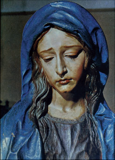 El más importante mecenazgo del que gozó José de Mora por ser escultor de cámara, el del rey Carlos II, es por desgracia el menos conocido. Quizás obras de su órbita en conventos madrileños, como el busto de Dolorosa del Monasterio de las Maravillas, u otras no conservadas para la Real Congregación de San Fermín de los Navarros, el Real Colegio de Atocha y la Iglesia del Hospital de los Aragoneses, fueran en origen encargos reales. Pudo tener más relevancia esta actividad para su prestigio en Granada que en la propia Corte. Aparte de la Dolorosa de las Maravillas, en Madrid se han conservado varias piezas relacionadas con el escultor bastetano: una del Real Monasterio de las Comendadoras de Santiago, atribuida por Sánchez Rivera a Mora o su taller, y una pareja de Ecce Homo y Dolorosa (Colección Abelló) que se ha podido contemplar hace poco, considerada de la etapa madrileña del maestro, aunque este punto aún está por comprobar con argumentos sólidos. Todas ellas presentan concomitancias más o menos evidentes con otras imágenes conocidas del artista, como las de Santa Isabel la Real o de Santa Catalina de Zafra, ya comentadas en nuestro especial. Presumiblemente, la pieza que abordamos en esta entrega sería fruto de un encargo de su etapa madrileña o estaría en relación con alguno de los personajes con los que Mora entró en contacto durante su estancia en la Corte. Esta Dolorosa fue dada a conocer, junto con otro ejemplar de la colección del marqués de Eguirior (Málaga), por el crítico de arte Ricardo de Orueta en el año 1927. Hay que recordar que Mora viajó en 1666 a Madrid para trabajar con Sebastián Herrera Barnuevo (discípulo de Alonso Cano), quien, por su cargo de maestro mayor de las Obras Reales (desde 1662), debió de facilitarle su entrada en el ambiente palaciego. A finales de 1672, Mora fue nombrado Escultor de Carlos II, entonces aún menor de edad, por muerte de Pedro de Obregón. Entre aquella fecha y 1679 residió en la Villa y Corte, realizando algunos viajes a Granada, donde permanecería de manera definitiva a partir de 1680. En la obra de José de Mora catalogada por Gallego Burín, hay dos tipos de bustos de la Mater Dolorosa: uno de ellos sigue el modelo de la Soledad de Becerra (Museo Nacional de Escultura, Museo de Bellas Artes de Granada) y otro muestra a María con el cabello caído hacia a ambos lados, como un manto esculpido que se fusiona con el de tela, y una túnica de cuello redondo que cubre su pecho; a este último tipo pertenece la obra que nos ocupa, así como las versiones del Convento de Santa Catalina de Zafra, del Convento de Santa Isabel la Real y del Victoria & Albert Museum de Londres. Las versiones granadinas fueron concebidas en pareja con un Ecce Homo, mientras que las de Madrid y Londres son piezas únicas. Todas ellas no incluyen las manos. |