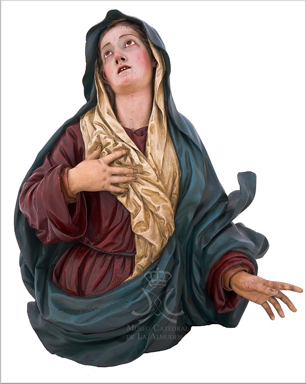 Esta dolorosa de busto, actualmente en el Museo de la Catedral de la Almudena, procede de la antigua parroquia madrileña de Santa Cruz. Desde entonces se ha atribuido a Carmona. Posee similitudes con la que se conserva en la Parroquia de Santa Catalina del Real de San Vicente (Toledo): la posición de ambas manos es prácticamente idéntica y también se trabaja la indumentaria de forma similar, si bien difiere en el rostro. |