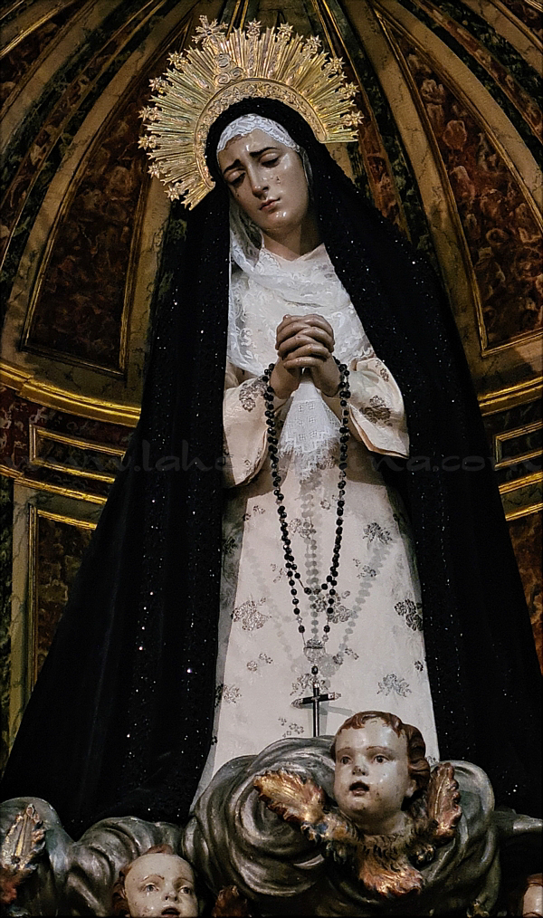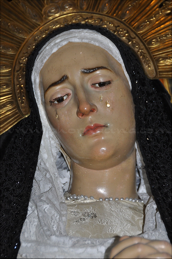 La talla participa en los desfiles procesionales del Real Sitio desde 1760, concretamente en la procesión del Viernes Santo o Procesión del Silencio, instaurada desde 1754, año en que desfilan por vez primera la imagen del Cristo titular de la Esclavitud y la de la Patrona, Nuestra Señora de los Dolores -a la cual se ha dedicado un artículo en este especial-, ambas salidas de la gubia del escultor navense. Hasta la construcción de sus nuevas andas, la dolorosa procesionaba en otras de menor tamaño de las que nacía un arco floral que cobijaba a la cruz y la imagen mariana; una decoración típica de la comarca, con ejemplos en la procesión de la virgen del Rosario de Valsaín. Respecto al atavío de la imagen, decir que la talla, cuyo bastidor original se conserva, era vestida desde antiguo siguiendo los dictámenes del luto cortesano castellano. Otras imágenes ya desaparecidas, como la Virgen de los Siete Dolores de Madrid o la Virgen de las Angustias de Aranjuez, seguían fielmente este orden vestidero que se componía de traje de toca de papos, prendas interiores, verdugado, falda interior sobre la que se vestía el monjil formado por cuerpo y falda, saya, tocas, rostrillo, rosario, estolas y manto negro, disponiendo la imagen de mantos antiguos y nuevos donados por los devotos y hermanos de su cofradía. Como presea luce una bella diadema de noble metal e incrustaciones de piedras preciosas, compuesta de un sistema de rayos y de estrellas que le dan esa redondez característica, apreciada ya en el mencionado grabado de 1764. Esta interesante pieza ha participado en exposiciones de arte sacro como "Las Edades del Hombre", en su edición de 2003, o en la reciente Darse la mano, exposición dedicada al arte sacro, la talla y la policromía en la madera en el Museo del Prado, siendo la única imagen vestidera en toda la exposición. A pesar de la sobrecogedora calidad de esta talla, desde una opinión como hermano de esta antigua Esclavitud -la cual necesita sabia joven y dispuesta al mantenimiento y puesta en valor de su patrimonio-, el trabajo de las camareras encargadas de su atavío no está a la altura de una imagen de Luis Salvador Carmona. Aunque es un trabajo hereditario y humano, todo lo humano necesita de un aprendizaje y corrección. De hecho, la Virgen de la Soledad no se presenta en su hornacina eclesial de una forma cuidada o estéticamente acorde a su calidad histórico-artística. Es una asignatura pendiente que podría solucionarse con la inclusión de un vestidor que aporte tridimensionalidad y triangularidad, necesarias para proporcionar el cuerpo y empaque que este tipo de obras requieren. A lo anterior habría que sumar una necesaria intervención que implique la limpieza, la restauración y la colocación de unos nuevos postizos, complementando y ensalzando todavía más si cabe la belleza de esta maravillosa y todavía desconocida dolorosa de Carmona. |