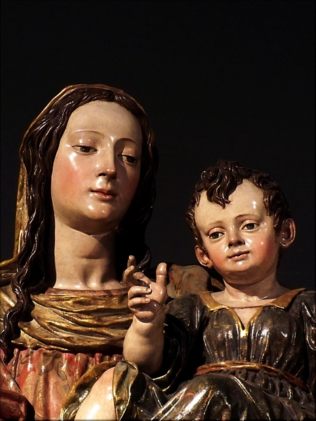 La imagen, realizada en la llamada "etapa magistral" del escultor (1606-1620), presenta notables semejanzas con otras hechuras de Montañés y su taller como la Virgen de la capilla del reservado del Monasterio de San Isidoro del Campo, en Santiponce (Sevilla), o la imagen mariana del retablo de San Juan Evangelista del convento sevillano de San Leandro, tal y como apreció el historiador Juan Infante Galán. También podemos observar rasgos comunes en los simulacros marianos de los relieves de la Adoración de los Pastores y Adoración de los Magos, que figuran en el retablo mayor de San Isidoro del Campo, e incluso en la Virgen de la Misericordia del Hospital de Antezana, en el municipio madrileño de Alcalá de Henares, labrada por Juan de Mesa y Velasco, el más brillante discípulo y colaborador de Martínez Montañés. La pieza, de composición cerrada y 152 cm de altura, responde a un concepto humanista, de marcado clasicismo e influencias todavía manieristas en su composición. Gracias al elegante contraposto insinuado bajo el ropaje, logra profundidad en el espacio e impresión de movimiento. Un movimiento que aún se halla atemperado por la ampulosa vestimenta y la pose mayestática. Madre e hijo muestran dulces semblantes y hermosas complexiones, con los típicos recursos montañesinos en su ejecución, caso de los ojos maternos de mirada oblicua, símbolo de la melancolía de la Pasión venidera, o la cabellera leonina del Niño Jesús, subrayando así en el rostro infantil el denominado "mimo montañesino" que imanta al espectador. Se ha querido ver mayor naturalismo en la imagen del Niño por su actitud más dinámica; sin embargo, como bien ha apreciado Luque Teruel, en la Virgen se observan también avances como el leve corte del cuello -una de las escasas imágenes de Montañés con ese recurso- que evidencian la introducción de un naturalismo pleno y su persistencia sobre las fórmulas compositivas derivadas del Renacimiento. Eso fue precisamente lo que convirtió a Martínez Montañés en un auténtico renovador formal de la escultura sevillana de finales del siglo XVI, apartándola de los modelos y los modos castellanos, tan italianizantes con la actividad y fuerte influencia de artistas como Juan Bautista Vázquez el Viejo y Jerónimo Hernández, entre otros. |
