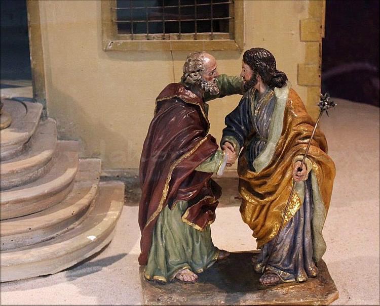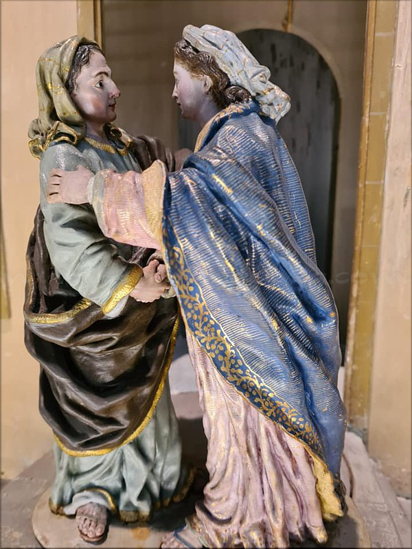Al ser la Visitación un tema que forma parte del ciclo navideño no es infrecuente su aparición en los grupos belenísticos más importantes. No podía faltar por tanto en el Belén realizado por Francisco Salzillo y sus discípulos, conservado en el Museo Salzillo de Murcia y formado por más de 550 figuras, siendo el conjunto más completo de las existentes en España, pues ninguno de los conservados alcanza tan elevada cifra. El Belén fue encargado por Jesualdo Riquelme al escultor hacia 1776, fecha de su primer matrimonio con Isabel María de Abad y Ulloa. Muerta ésta diez años después, lo fundamental del Belén quedaba realizado, ya que el fallecimiento de Isabel María tuvo lugar tres años después de la muerte de Salzillo, en 1786. La lectura del Protocolo de Atienza, o inventario realizado tras la muerte de Jesualdo Riquelme en 1798 por Roque López y el pintor Joaquín Campos, permite comprobar que la obra fue fruto de un dilatado período de tiempo -1776 a 1800- y establecer atribuciones a Roque López, José López, Pedro Collado -carpintero que realizó el Pórtico del Nacimiento- y otros artesanos y artistas. Tres fases de ejecución se deducen. La primera comenzaría en 1776 y concluiría con la muerte del escultor (1783). En ese tiempo Salzillo había acabado el último grupo procesional para la Cofradía de Jesús y toda la experiencia adquirida en tan importante proyecto dio paso a una obra diferente, a una forma distinta de ver la realidad y de interpretar el misterio navideño. Las claves del Belén -narración, sentido jerárquico del color, alejamiento consciente del precedente napolitano al inspirarse en el campesinado español, utilización de modelos previos, presencia de la fiesta urbana, etcétera- quedaron ya trazados por su creador de forma que, en los años sucesivos a su muerte, se introdujeron nuevas arquitecturas y escenas sin variar la concepción originaria dada por Salzillo, sino respetando un estilo común, las técnicas mixtas propias de la imagen devocional y un sistema proporcional que garantizaba la unidad del Belén. La segunda fase debió prolongarse entre 1783 y 1798, fecha de la muerte de Jesualdo Riquelme, periodo en el que Roque López modeló la escena de la Visitación, datada a partir de 1786, y otras como las figuras de Herodes y su guardia. Para el grupo de la Visitación, que demuestra la citada coherencia del taller, López empleó una serie de signos formales que delatan el magisterio de Salzillo; de hecho, José es la misma figura que la representada en el Nacimiento labrado por su maestro, con túnica verde azulada y manto amarillo, y Zacarías se asemeja al anciano Simeón, del templo de Jerusalén, también de Salzillo. La escena resulta también en este caso muy emotiva, pues vemos un doble abrazo, ya que al de María e Isabel hay que sumar el que se dan José y Zacarías. Ambos varones, como ya sabemos, no se mencionan en el evangelio de Lucas, lo que nunca ha sido óbice para los artistas a la hora de incluirlos en el pasaje. Al heredar Antonio Riquelme la colección y efectuada la partición de bienes, podemos establecer una tercera fase que comenzó cuando le fue encargada a Roque López la vistosa y dramática Matanza de los Inocentes. Teniendo en cuenta que uno de los propósitos narrativos del Belén era el de mostrar de forma continua y sin lagunas un relato inspirado en los evangelios de Mateo, Lucas y los apócrifos, es obvio este encargo, pues la Huida a Egipto, nombrada en el Protocolo de Atienza, no podía ser entendida sin el decreto herodiano, motivo por el que la Sagrada Familia emprendió apresuradamente el viaje a Egipto. 1800, fecha del documento, es la última referencia cronológica del Belén. |