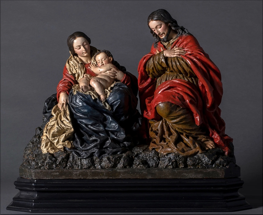 Este grupo escultórico en bulto redondo, labrado en terracota policromada, se encuentra dispuesto sobre una base de madera y corcho tintada en tonos oscuros, simulando un terreno rocoso sobre el que se asientan las efigies que integran el grupo: la Virgen con el Niño en su regazo, a la izquierda, y san José en actitud orante, a la derecha. Ambas se presentan como figuras independientes, dispuestas una junto a la otra, separadas por un eje compositivo central que constriñe a cada una de estas dos figuras dentro de su propio espacio. En su parte posterior, el grupo se encuentra sin modelar y la base sin labrar, lo que evidencia un destino original claro de la pieza, pensada para estar pegada a una superficie vertical. Probablemente, esta hubo de ser un fondo pictórico que vendría a completar la escenificación del pasaje. Sus estilemas motivaron al historiador granadino José Antonio Díaz Gómez a sentar la atribución de la autoría de esta pieza de pequeño formato (50 x 65 x 28 cm), actualmente en manos privadas, al célebre artista granadino José Risueño Alconchel (1665-1732), que exportó a la escultura los esquemas que venía planteando en la pintura, su principal dedicación, siguiendo la estela de Juan de Sevilla. Por otra parte, en el campo estrictamente escultórico, la emoción introvertida, el gesto grácil, la composición cerrada y la economía cromática seguirán siendo, como en Alonso Cano y en los Mora, una constante en la producción de Risueño, quien encontró en el modelado en barro el soporte en que se mostró más creativo, personal y cómodo. |