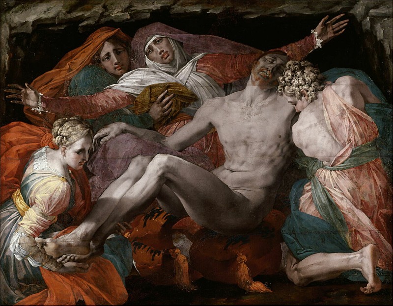 Esta trágica Piedad muestra a Jesús siendo depositado en el sepulcro por Juan y la Magdalena, mientras otra santa mujer consuela y sostiene a la Virgen, sentada y al borde del desmayo, cuyos brazos se abren tomando forma de cruz en señal de sufrimiento. El ajustado encuadre empuja unas figuras casi escultóricas al primer plano, deja el sepulcro casi invisible y acentúa la monumentalidad de un óleo pintado en origen sobre tabla, siendo traspasado en 1802 a lienzo (127 x 163 cm) siguiendo la costumbre estética francesa de la época. El pintor renacentista Rosso Fiorentino (Florencia, 1496 - Fontainebleau, 1540) llegó a Francia en 1530 para trabajar en la decoración del castillo de Fontainebleau. El noble militar Anne de Montmorency le encargó esta obra para su castillo de Écouen, posiblemente junto a un retablo que el artista florentino no pudo finalizar debido a su fallecimiento, si bien se desconoce la fecha exacta del contrato. Los cojines sobre los que descansa el cuerpo de Cristo tienen los colores del escudo de armas de Montmorency. El cuadro ilustra las aspiraciones formales e intelectuales traídas por los artistas italianos a Francia. Rosso Fiorentino con su Piedad trajo a Francia una nueva visión de la figura humana, que encuentra sus raíces en el manierismo florentino: cuerpos alargados, formas expresivas, pliegues angulosos y vivos colores. Hablamos además de la única pintura de caballete que se puede fechar con certeza durante su estancia en Francia. El Concilio de Trento se opuso a este tipo de pintura por ser demasiado descarnada para los temas religiosos. En 1798 fue llevada al Louvre de París, donde se sigue conservando. Delacroix se inspiró en ella para pintar en 1844 su obra "Descendimiento" del templo parisino de Saint-Denys-du-Saint-Sacrement. En 1997 la restauración de la pieza renacentista llevada a cabo en los laboratorios del Louvre reveló la presencia de una composición anterior en la que se invierte la disposición de las figuras. Sin embargo, no está claro si esta pintura subyacente era una obra terminada y luego rechazada por Rosso o simplemente un diseño susceptible de modificación. |