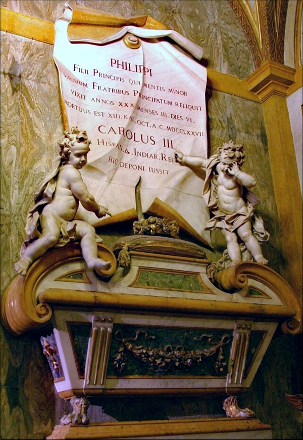Un último ejemplo es la pareja de ángeles para el monumento funerario de Felipe de Borbón, el hijo mayor del rey Carlos, diseñado por el arquitecto Ferdinando Fuga para la basílica napolitana de Santa Clara. El monumento fue realizado en 1777, y dio una gran oportunidad a Sanmartino, convertido en el gran protagonista de la escena escultórica napolitana, para distinguirse también en la corte borbónica. Junto con los del cenotafio Ippolito de la iglesia napolitana de los Santos Apóstoles, son estos quizás los ángeles más dolientes de Giuseppe Sanmartino, especialmente el de la derecha, cuya mano lleva al rostro para enjugarse el llanto mientras con la otra señala el gran lienzo marmóreo. El ángel de la izquierda señala directamente al sepulcro del infante. A diferencia de los ya analizados ángeles del cenotafio Sersale, de expresión ensoñadora que roza lo jovial, aquí prima una vertiente triste cercana a lo pasionario. |