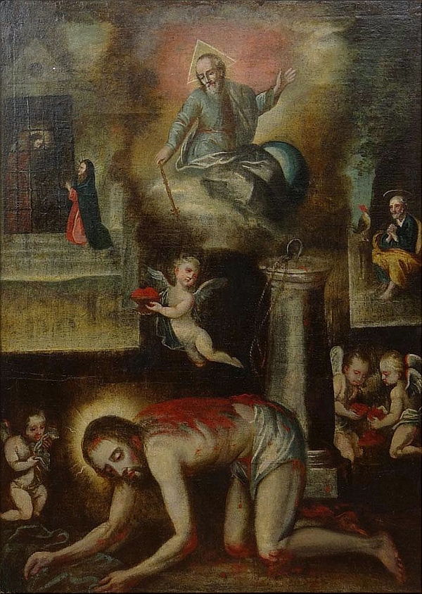 Esta singular representación pictórica se atribuye al pintor quiteño Antonio Salas (1784-1860), considerado el más exitoso artista de su época en Ecuador. Fue vendida en el mercado del arte hace once años a través de una subasta pública que la casa estadounidense Kodner (Dania Beach, Florida) celebró el 24 de abril de 2013. Pintada al óleo sobre lienzo, luego transferido a tabla, mide 80 x 55,8 cm. Llama la atención en una escena que suele representar a Cristo en solitario -a excepción ocasionalmente de los verdugos o, en el caso de artistas como Velázquez o Murillo, de figuras angélicas y alegóricas- muestre en este caso una simbología tan abundante como peculiar, pues junto con los querubines llorosos que lamentan el tormento de Jesús y recogen su sangre como fuente de vida, hay que sumar la representación en la zona superior de Dios Padre, dispensando con su cetro la gracia divina, y en mayor segundo plano, dos escenas previas a la flagelación: la negación del apóstol Pedro arrepentido y una curiosa representación del Redentor preso, tras las rejas de una celda a la que se accede por una escalinata, siendo visitado por la Virgen, que, arrodillada, reza por su destino. Aunque las obras más conocidas de Salas son civiles y constituyen los retratos de los generales que participaron en los procesos de independencia de Quito, el pintor nunca pudo, supo o quiso abandonar del todo el lenguaje plástico propio de la práctica decorativa del Barroco. Ni siquiera en dichos retratos, anteponiendo los modos de la pintura religiosa barroca sobre un débil asimilación del retratismo neoclásico. Lo anterior se debe a que la mayoría de sus encargos fueron religiosos, desde los sectores públicos o privados. Por ello, tanto Salas como muchos otros pintores decimonónicos quiteños guardaron celosamente en sus talleres decenas de grabados antiguos, de los cuales seguían reproduciendo imágenes, así como cuadros, esculturas o marcos coloniales. Ello puede considerarse un incipiente coleccionismo particular, cosa que puede observarse en el mismo inventario de los bienes de Antonio Salas realizado en 1824. |