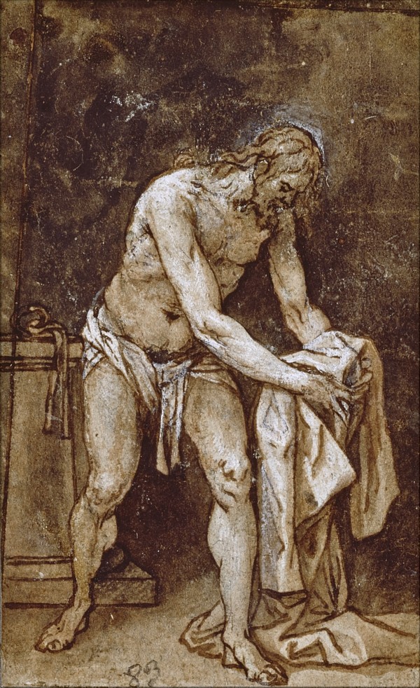 Este dibujo sobre papel verdoso del artista granadino Alonso Cano (1601-1667), claramente relacionado con la pintura sobre el mismo tema de la Real Academia de Bellas Artes de San Fernando y con los bocetos preliminares de una figura semejante orientada al revés, conservada en la Biblioteca Nacional de España, puede haber sido un boceto preparatorio para un cliente o quizás el prototipo de un discípulo a seguir. La obra se conserva en el Museo Nacional del Prado de Madrid. En ella Cristo se aparta de la columna de la flagelación y se inclina para recoger sus vestiduras del suelo. Su mirada hacia abajo y la postura de todo el cuerpo crean una impresión de tristeza, introspección y calma profundas. La geometría del cuerpo, cuidadosamente dispuesta, genera equilibrio a pesar del movimiento implícito de la figura. En esta pequeña pieza (12,2 x 7,5 cm), en la que se mezcla la aguada, el lápiz y la tinta, Cano plasma un pedestal de columna arqueológicamente exacto, basado en el de la basílica romana de Santa Práxedes, que se supone que fue el de la flagelación de Cristo. El extenso trabajo posterior de tres manos en este dibujo ha destruido la posibilidad de contemplar la delicada técnica de la aguada de Cano, y ha alterado la calidad original, sin duda exquisita. |