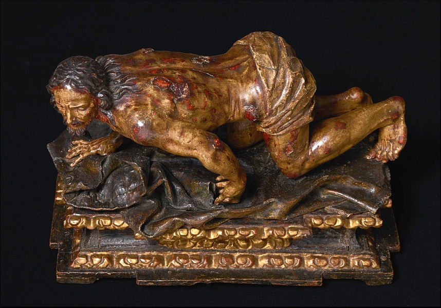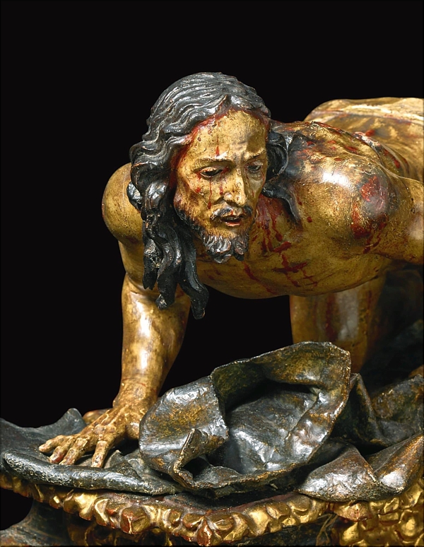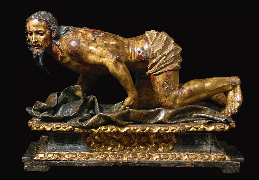 Esta talla de pequeño formato (32,5 x 45 x 26,5 cm) fue expuesta en la edición del año 2014 de TEFAF Maastricht, del 14 al 23 de marzo, tras lo cual fue adquirida por una colección privada inglesa. Romero Torres la consideró una obra conjunta de los hermanos escultores e imagineros granadinos José y Diego de Mora. Para Palomino Ruiz puede ser obra completa de Diego de Mora, sin intervención de su hermano José. Se trata de una obra en madera policromada, con ojos de cristal y tela encolada para la túnica. La composición presenta a Cristo en la postura que ya conocíamos de la talla que José de Mora realizara para el convento alcantarino de Granada, si bien presenta la variación de girar su cabeza para dirigirse al fiel que lo contempla. Se coloca completamente arrodillado sobre su túnica, la cual intenta recoger con la mano derecha, que presenta la disposición de muñeca flexionada y dedos recogidos propia en las obras de Diego de Mora. La mano izquierda queda adelantada y extendida para servirle de punto de apoyo, junto con las rodillas. Anatómicamente es una obra bien proporcionada, con una cabeza rotunda en su estructura ósea, marcada y definida, tan característica de los Mora. Llama poderosamente la atención su espalda lacerada, siendo la ejecución de las heridas una simbiosis entre talla y policromía que, aunadas, incrementan el realismo de las llagas. |